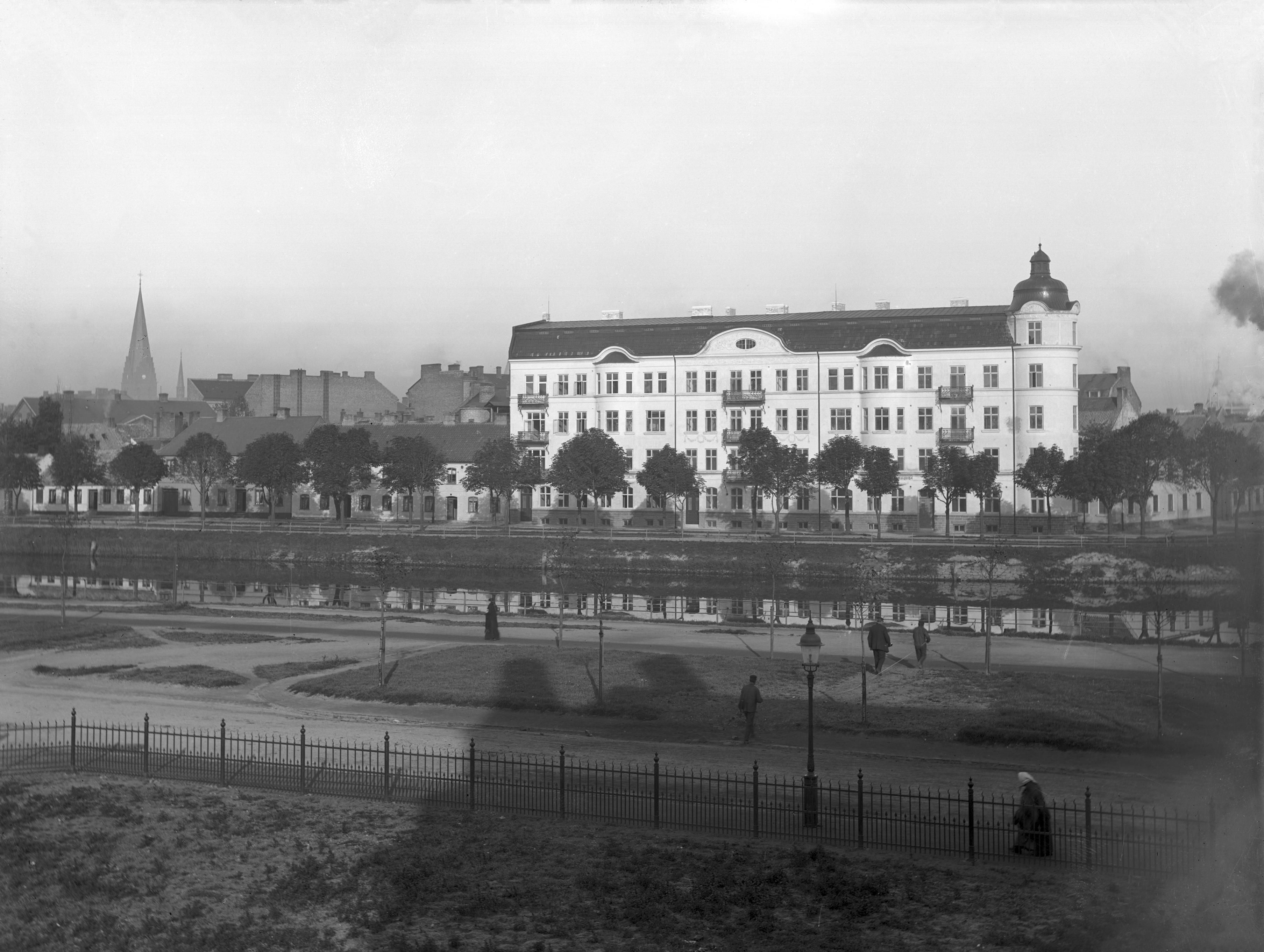EF 001069 :: stadsbebyggelse, stadsgata, kanal, kyrka, gatubelysning, träd, staket, balkong, flerbostadshus