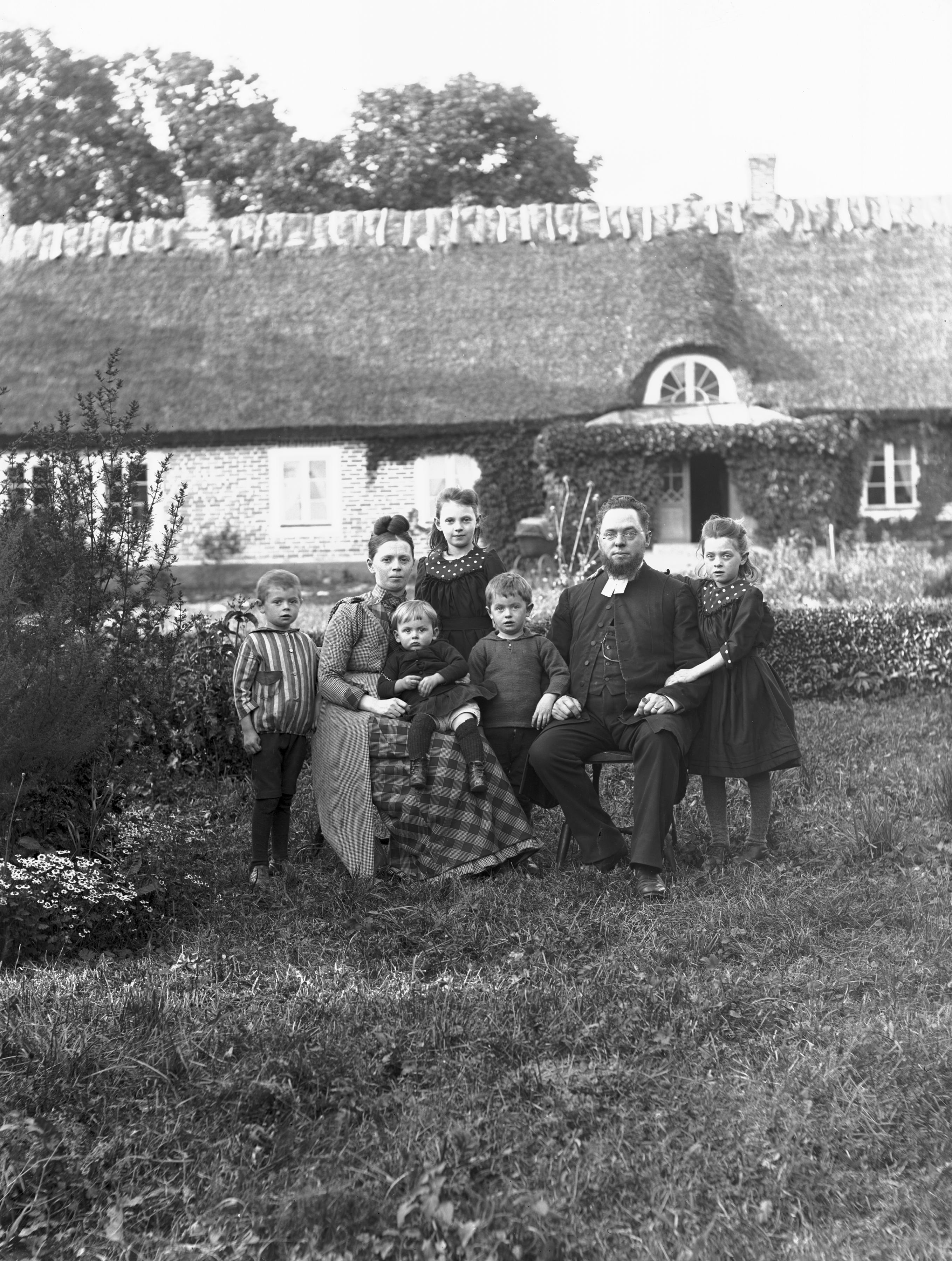 Familj framför bostad tillhörande Dybecks gård. Mor, far och fem barn.