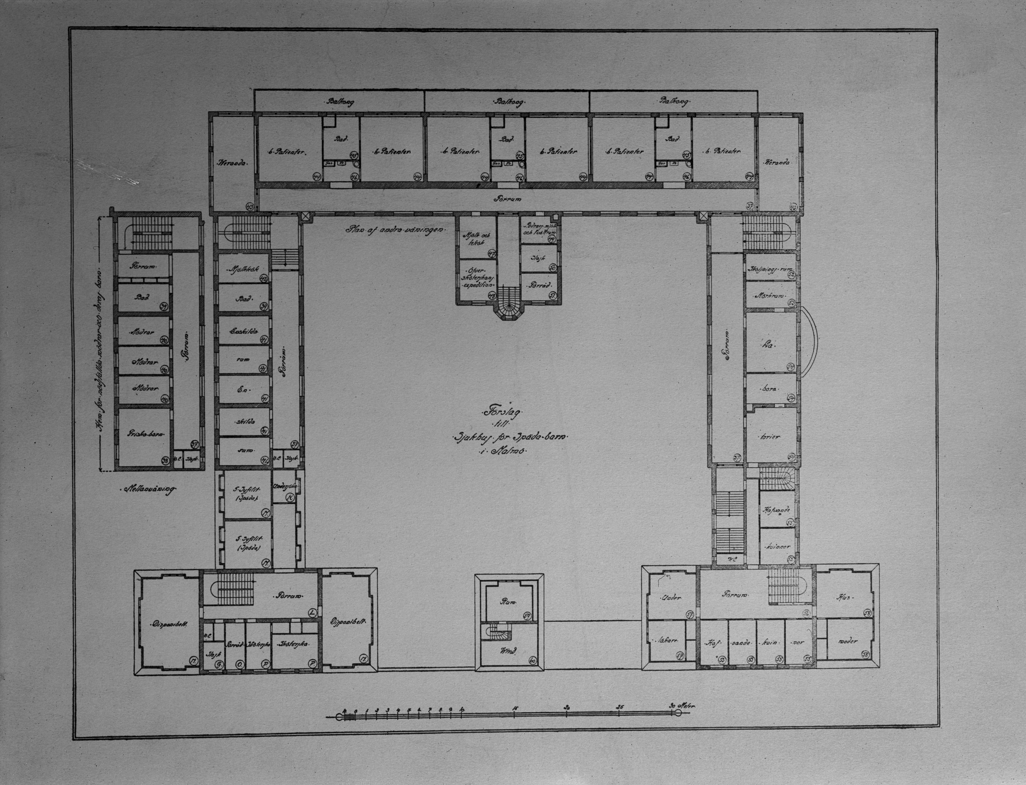 Förslag till sjukhus för späda barn i Malmö. Planritning.