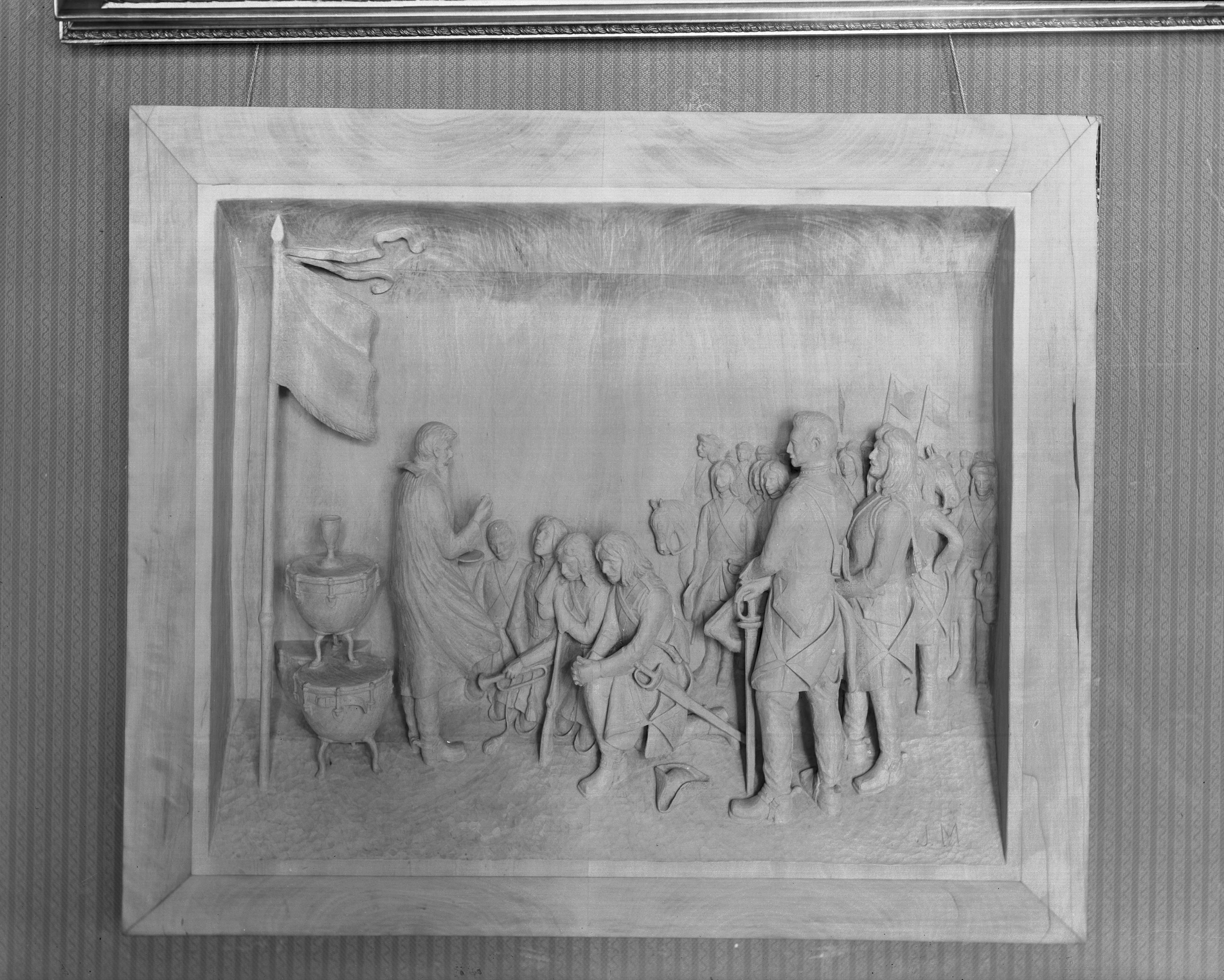 Träskulptur efter Gustaf Cederströms tavla "Regementets kalk". utförd av musikfanjunkaren Johan Malmöström omkring år 1900. Tillhör konsulinnan Margarethe Engeström.
