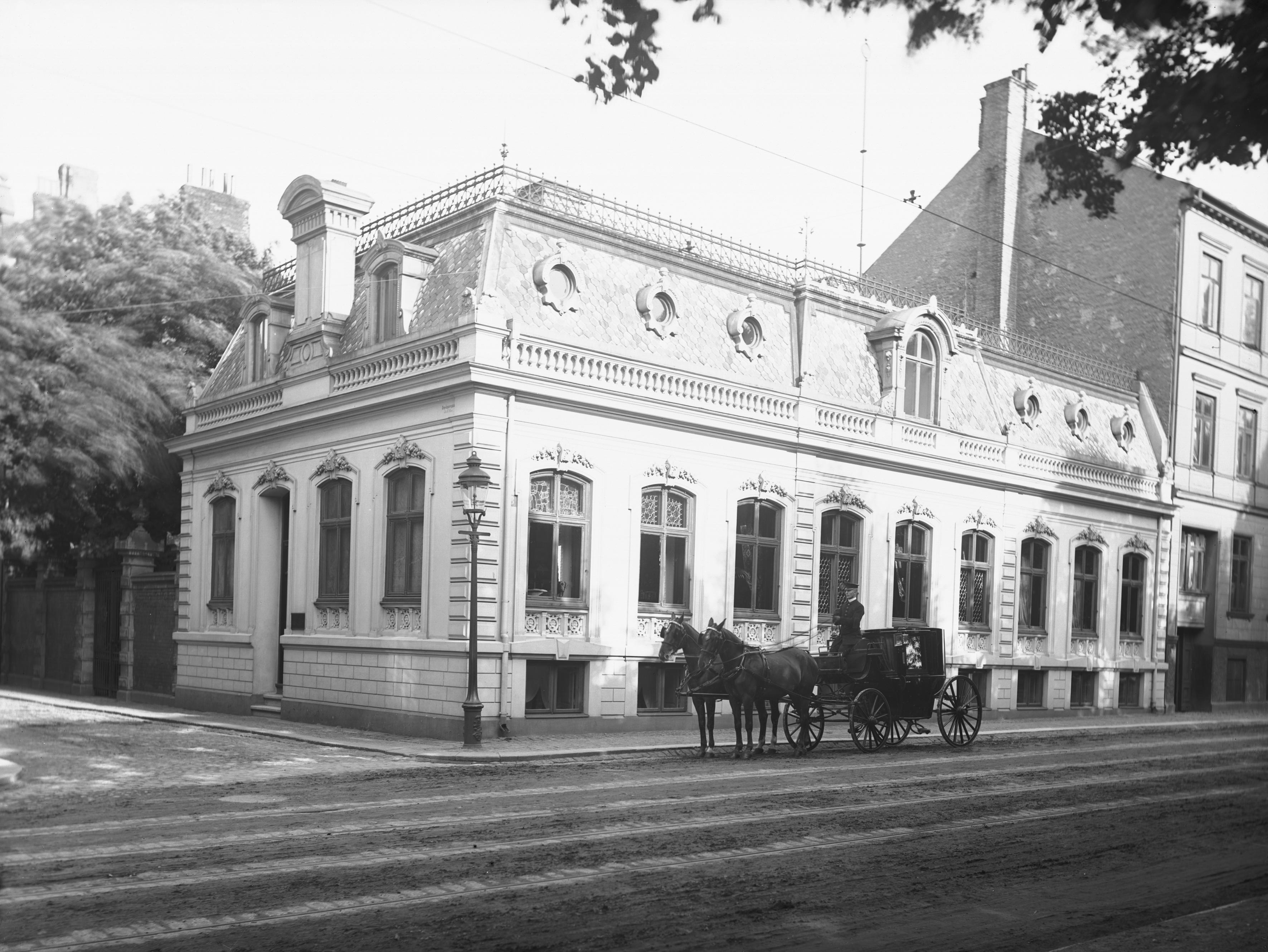 Doktor Carl Asps hus på Slottsgatan 8, kvarter 37, Biet. 1907. Hästdroska och kusk.