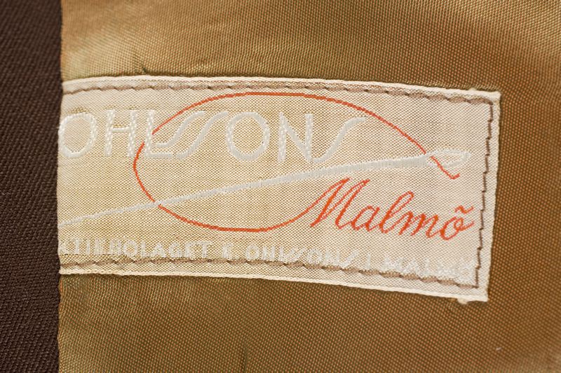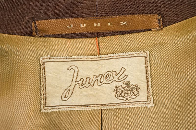 med fyra stycken mörkbruna knappar, lång, rak ärm, axelvaddar, brungrönt konstsilke foder. Utställd kjol i åtta våder. Maskinsömnad, underarbete för hand. Märkt med etikett "Junex".