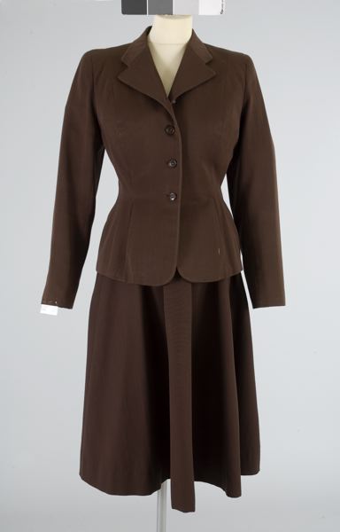 Dräkt, New Look 1948, av brun yllegabardin. Jackan figursydd med