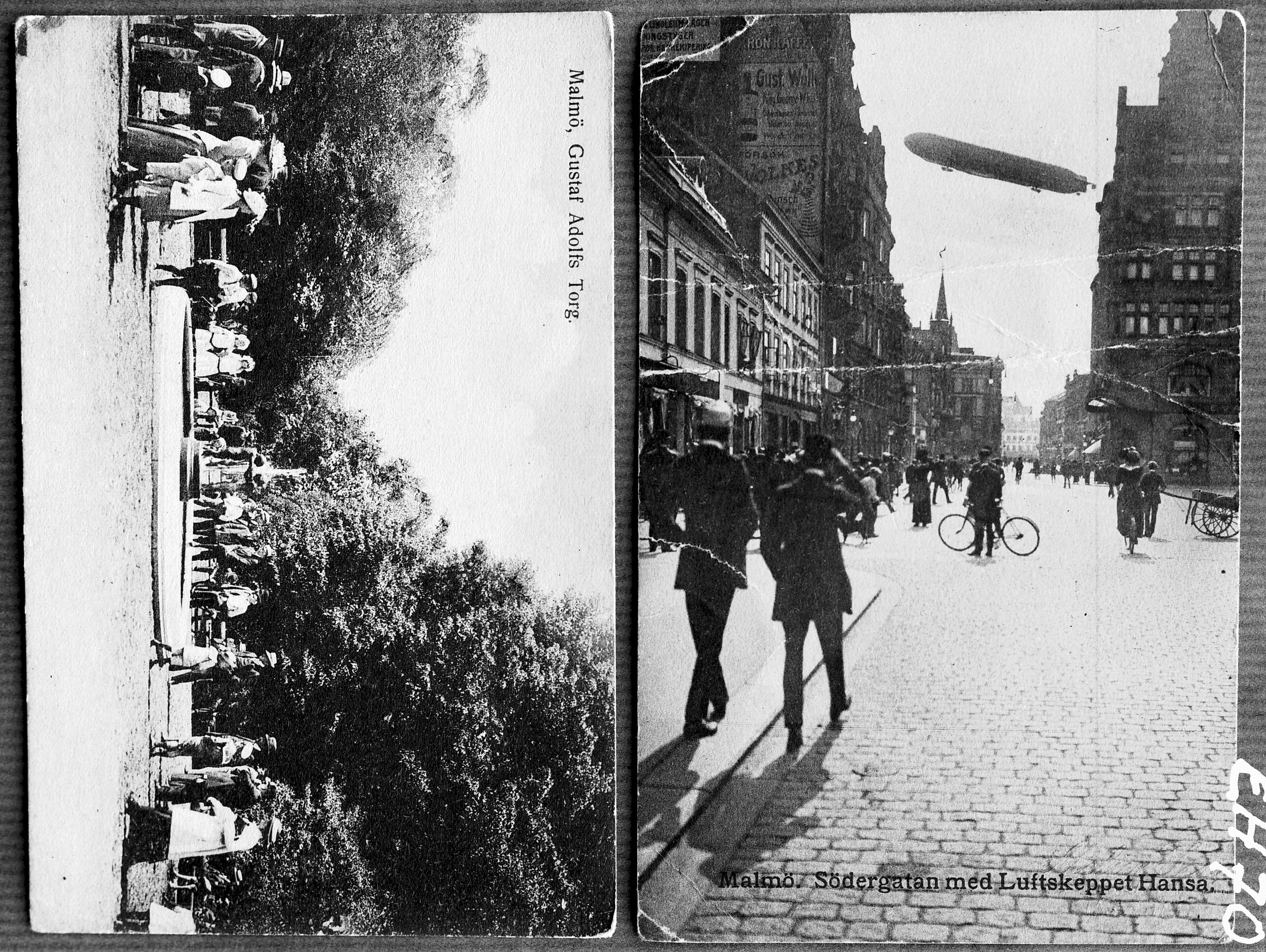Södergatan med luftskeppet Hansa Två motiv, Gustav Adolfs Torg