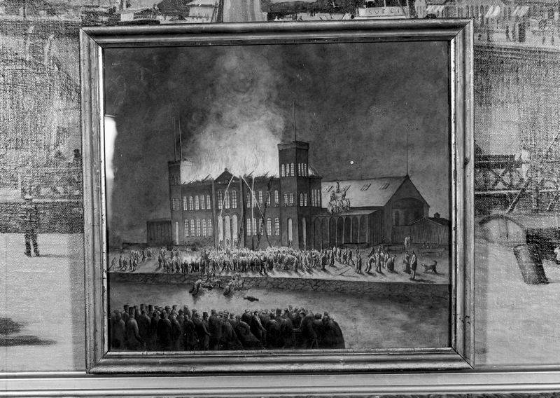 Centralstationen, branden 1868, akvarell av okänd konstnär. Se MM 044034