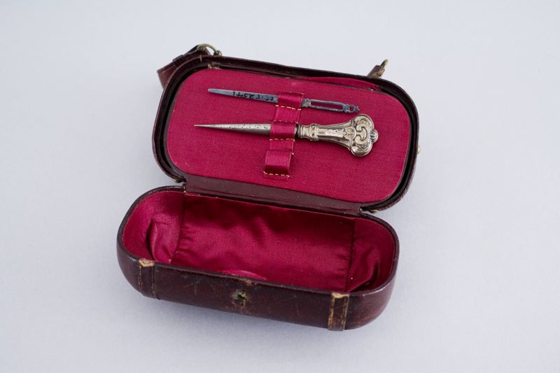 Innehåll. nål, pryl, nålfodral och vax.