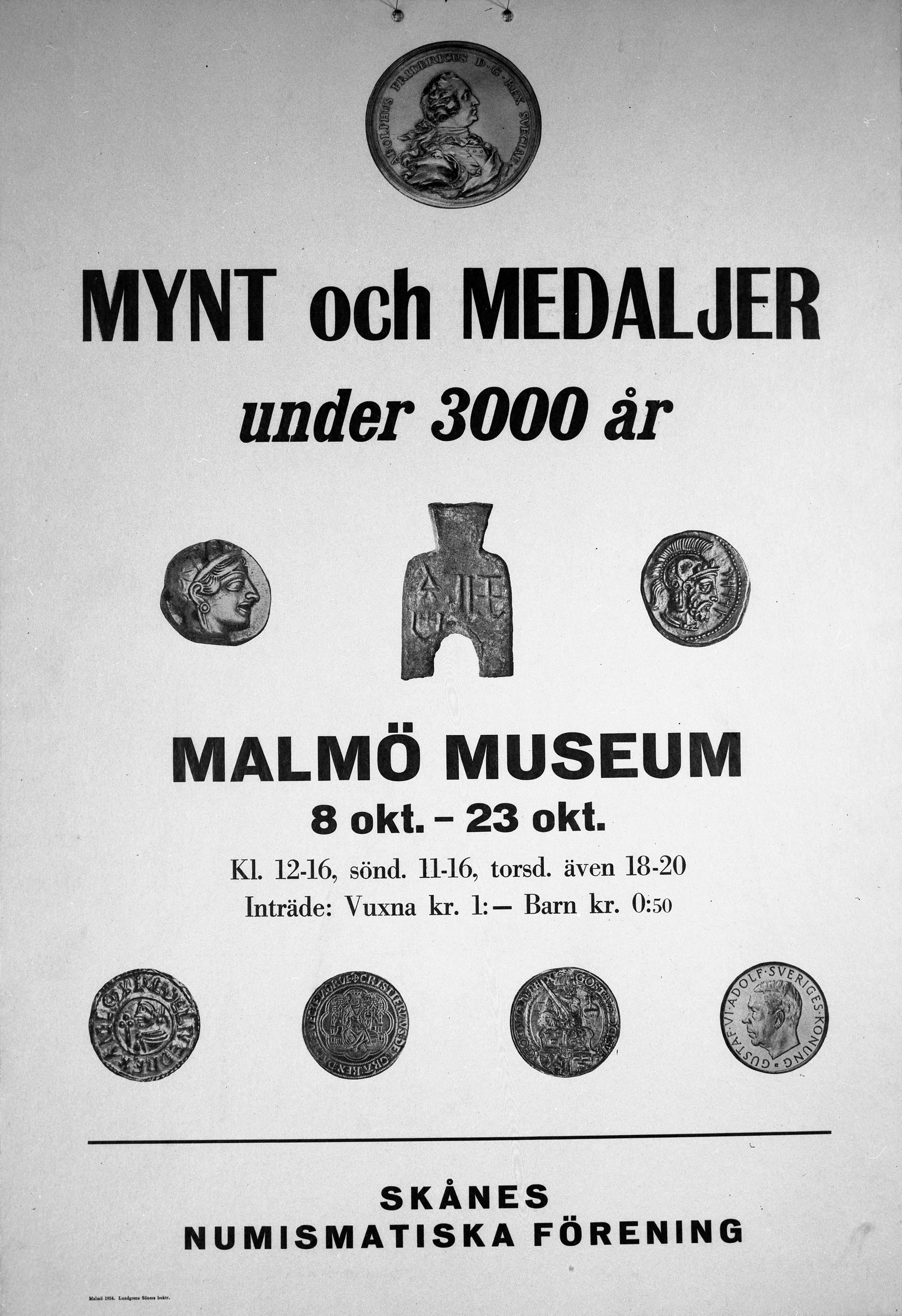 Utställningsaffisch Mynt och medaljer under 3000 år. Utställning i samarbete med Skånes numismatiska förening på Malmö Museum 8 oktober-23 oktober 1954.