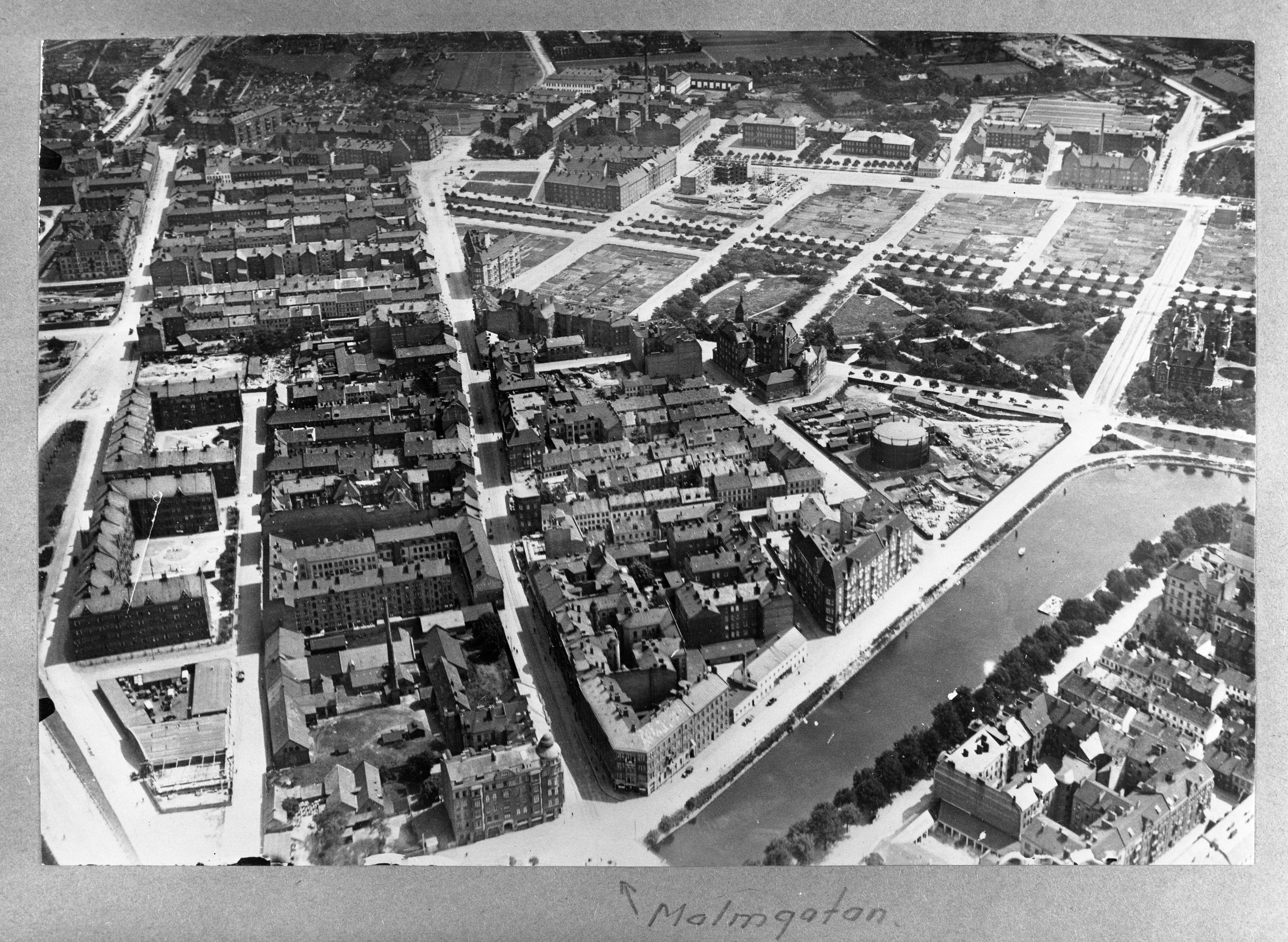 Flygfoto över Rörsjöstaden och Östra Förstaden med Östra Förstadsgatan, Exercisgatan och Östra Förstadskanalen.