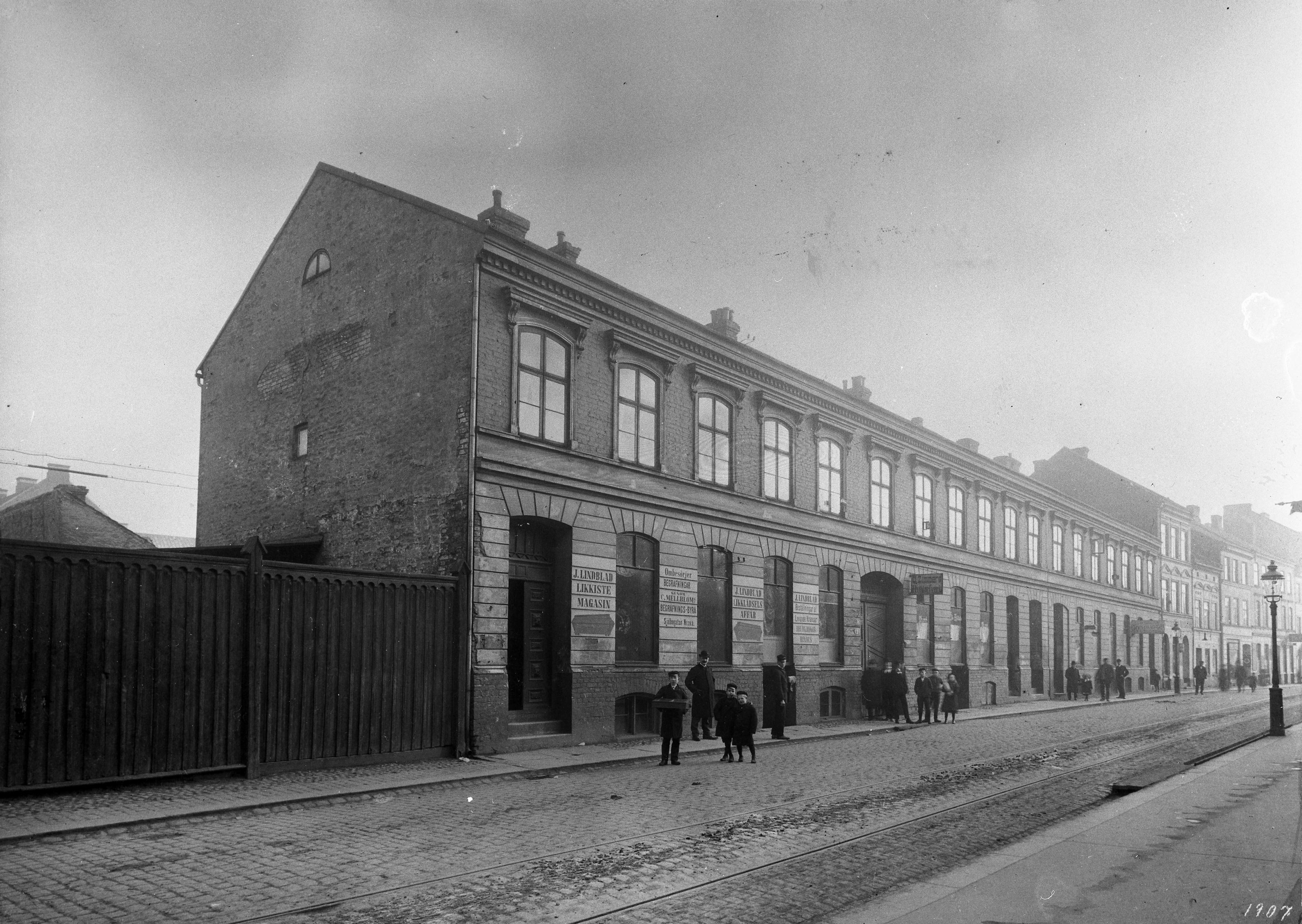 - Kvarteret Kasper, Östra Förstadsgatan, människor på trottoaren. Bakom planket till vänster fanns en tändsticksfabrik. Längst till vänster högst upp ses gaveln till det s k gamla järnvägshuset vid Slussgatan kvarteret Håkan.
