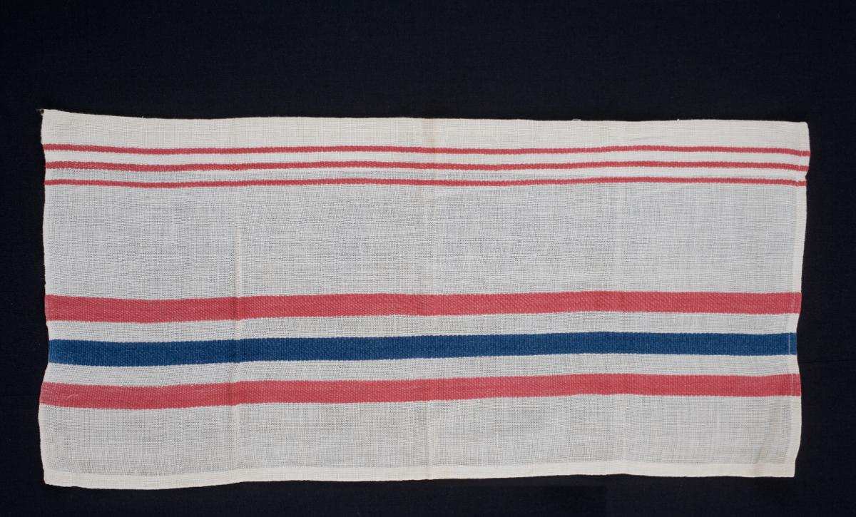 Gardinkappa av bomull, vit gles tuskaftbotten med ripsränder i rött och blått.