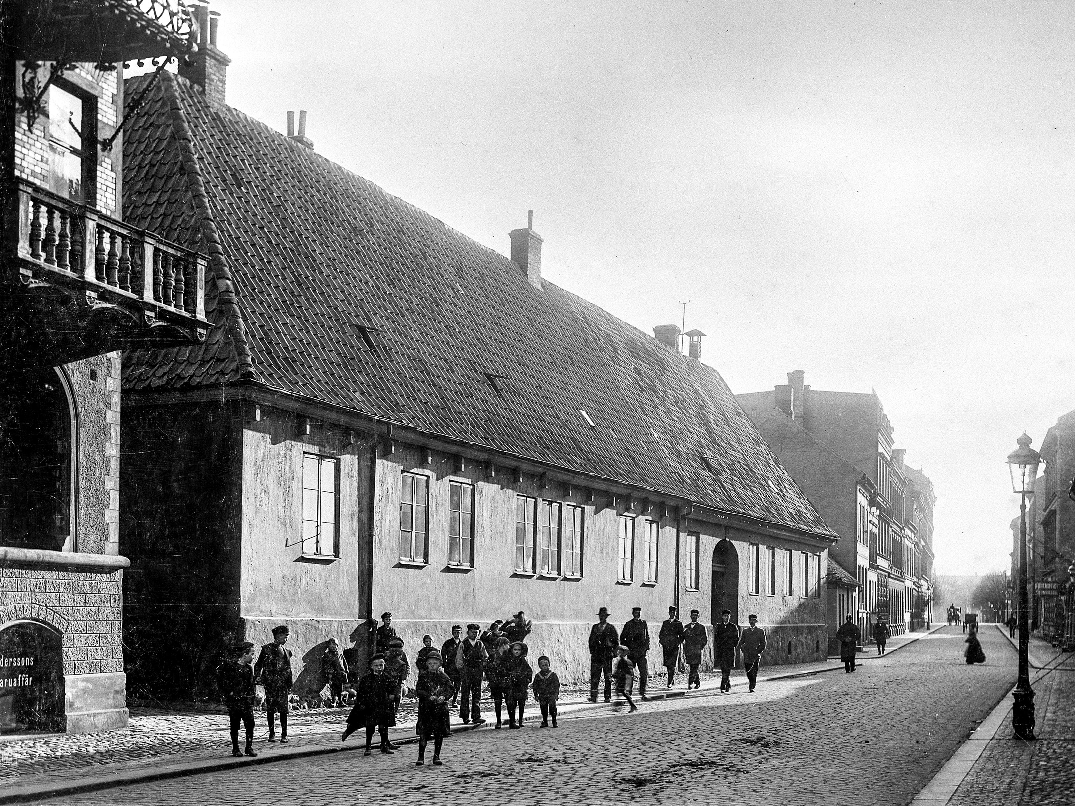 I vänsterkantn är Skeppsbyggarmästare Julius Bonnesens trevåningshus, uppfört 1872. Han med speditören och handelsmannen Hans Friis hade Malmös tidiga skeppsvarv, "Malmö Varv", etablerat 1854. Kockums Mekaniska verkstad började sitt varv 1872. Synd där inte finns någon enda bild på hela fastigheten. Idag hade det varit Västergatan 20. Innan 1913 var det Västergatan 72. Den smala gränden är den tidigare Peder Diersens Strede långt tillbaka i tiden.Magnus (Malmö Museer)2018-06-01 09:34