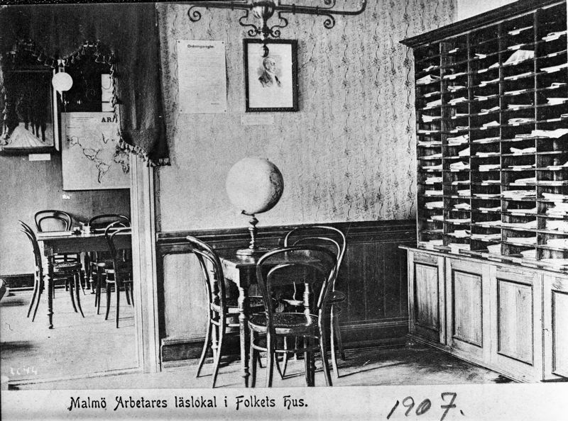 Interiörbild från Folkets Hus Malmö Arbetares läslokal