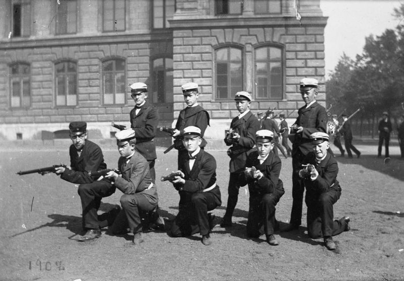Malmö Latinskola. Skolpojkar i militärövning på skolgården.
