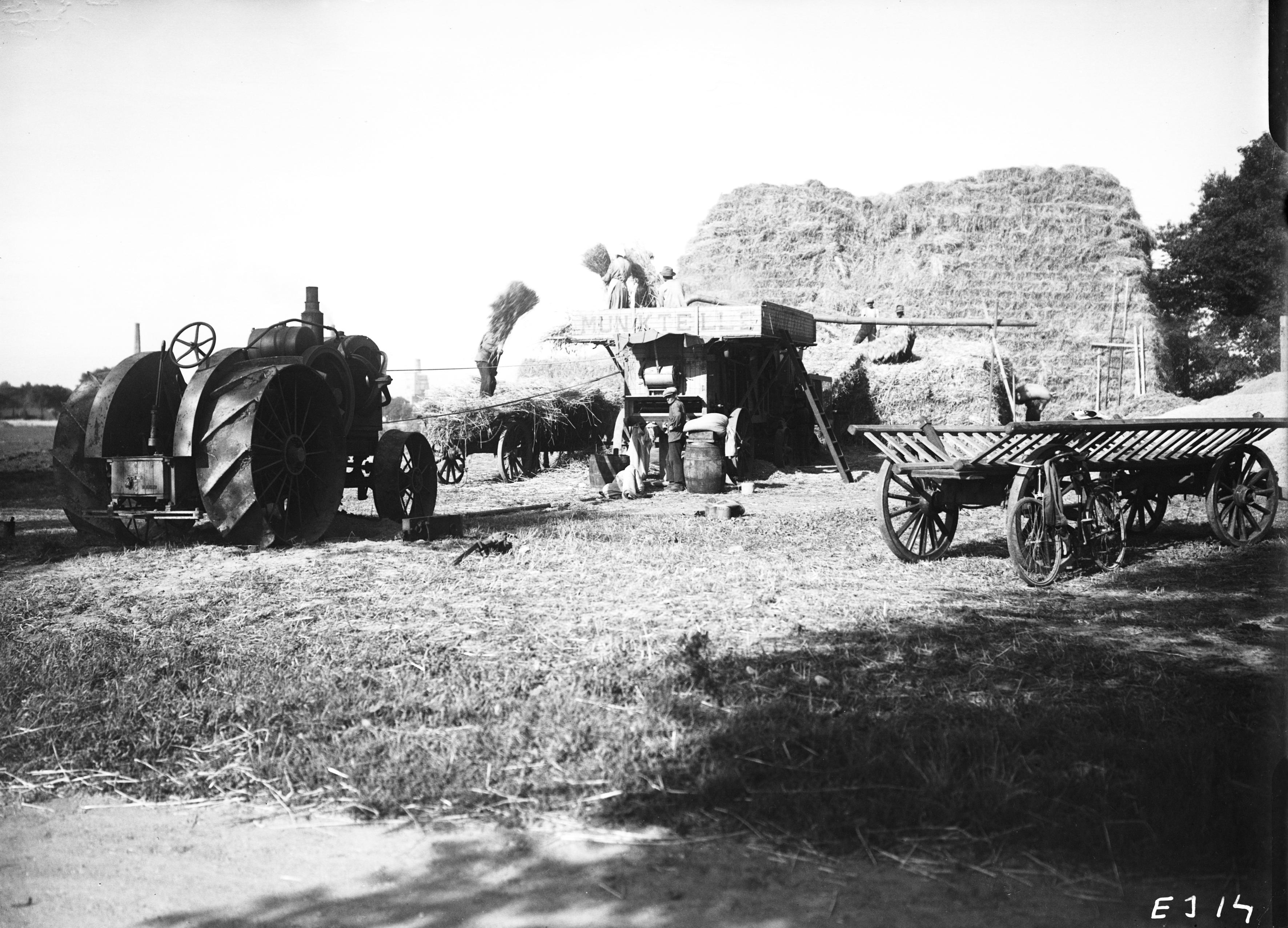EJ 000014 :: jordbrukstraktor, tröskverk, tröskning, cykel, vagn, traktor