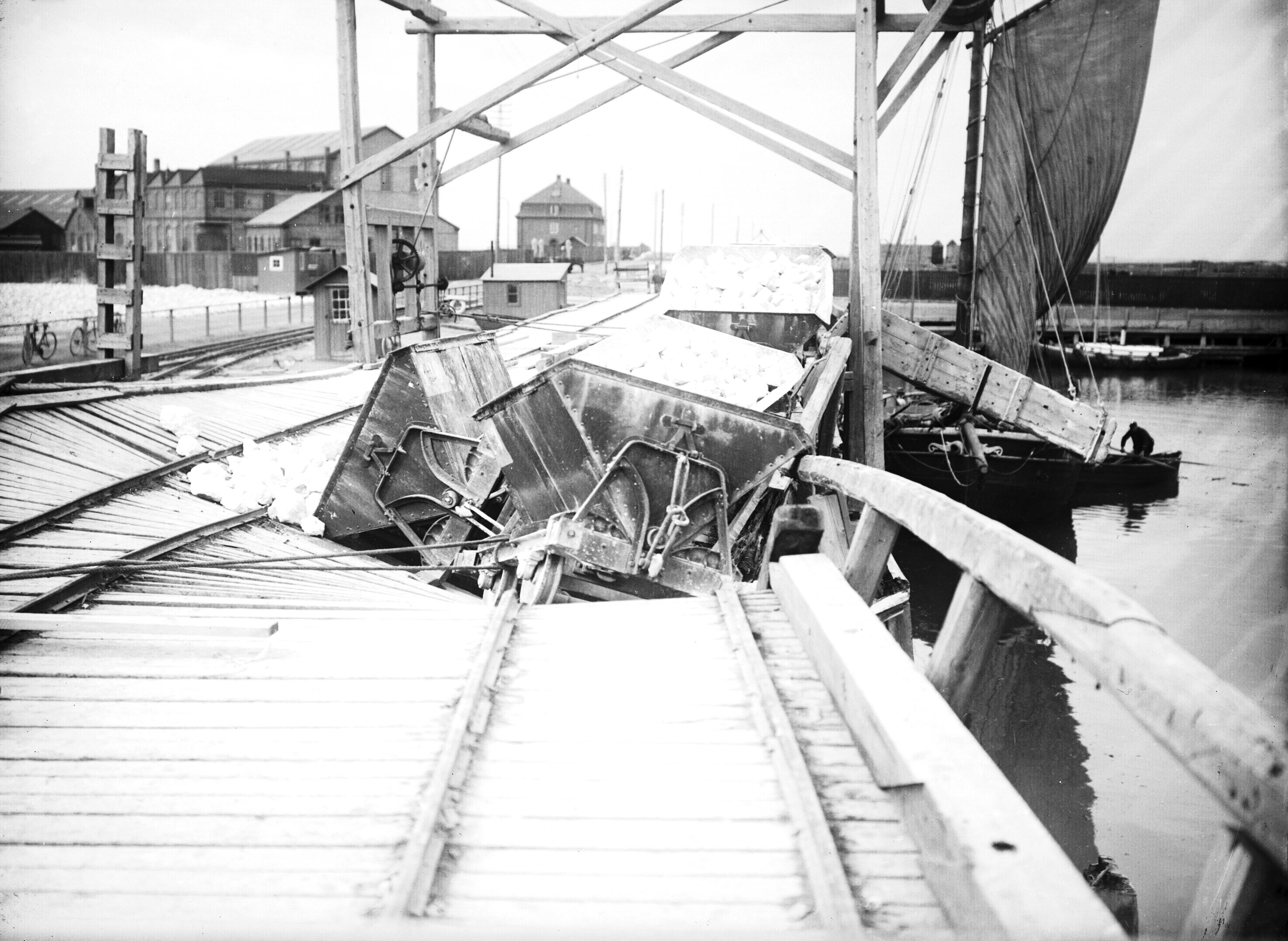 Limhamn. Övägen och Ön. Kalkvagnar har brakat igenom kajen.