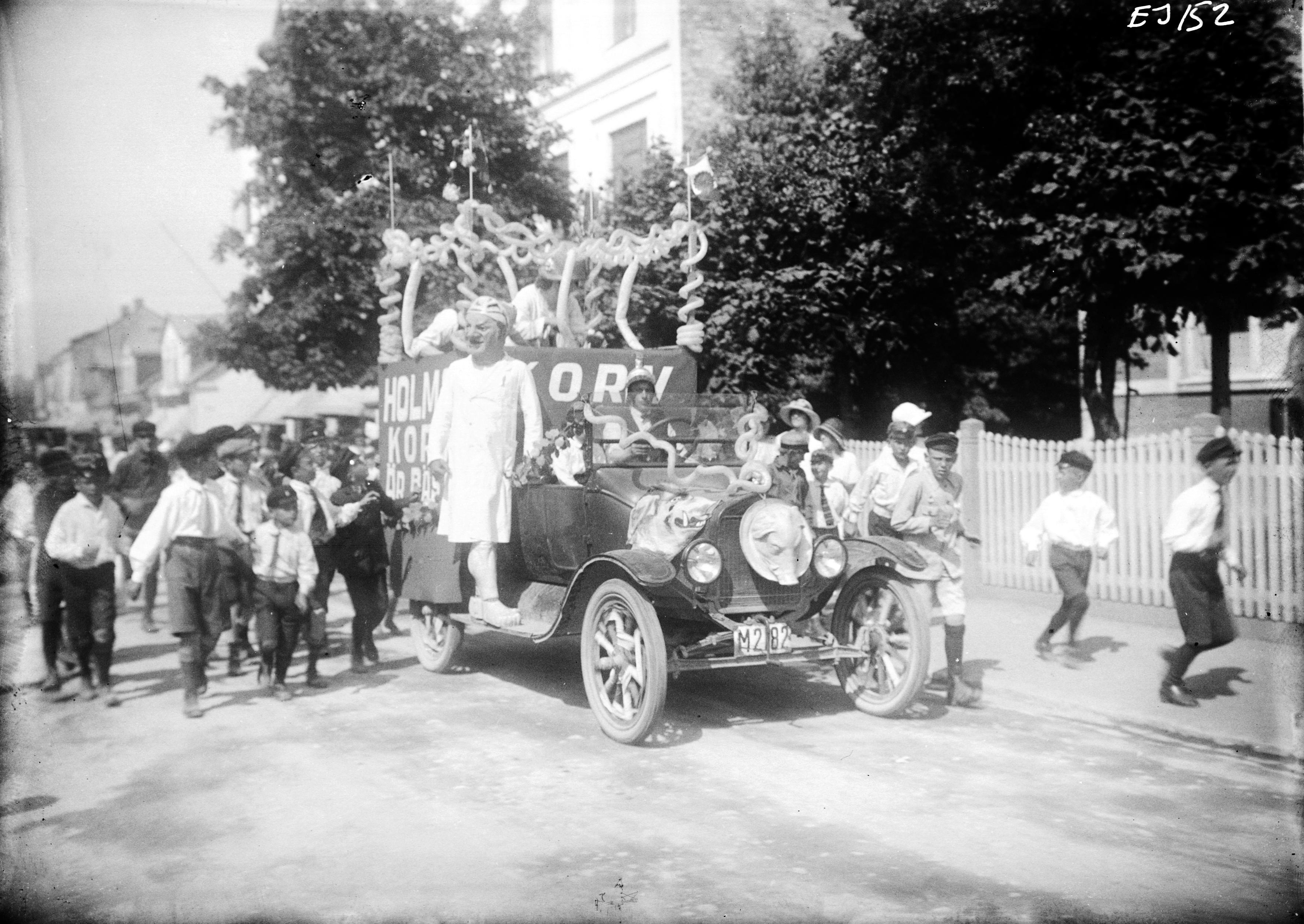 Limhamn. Hantverksföreningens karneval. År 1923? Lastbil med reklam för Holms korv. Chaufför A. Lilja, sedermera i Hörby.