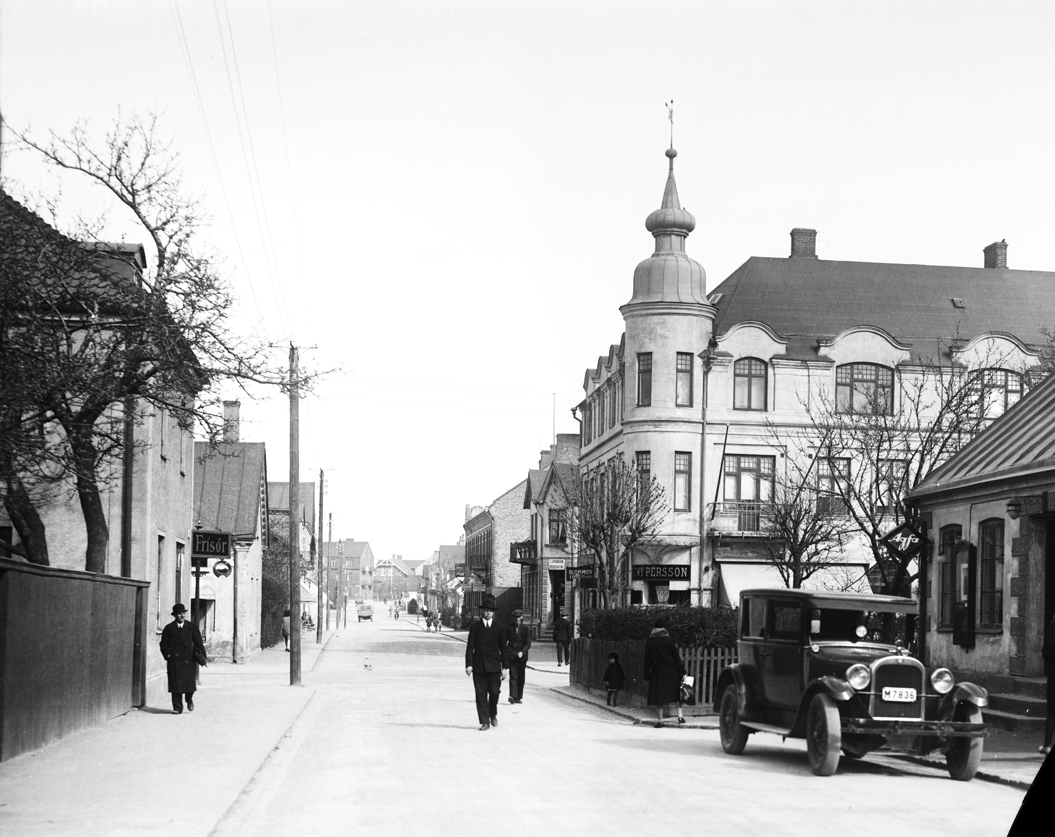 Limhamn. Sveagatan vid Järnvägsgatan med Eric Jeppssons hus och gatans fortsättning mot öster. Bilen M7836 parkerad på gatan.