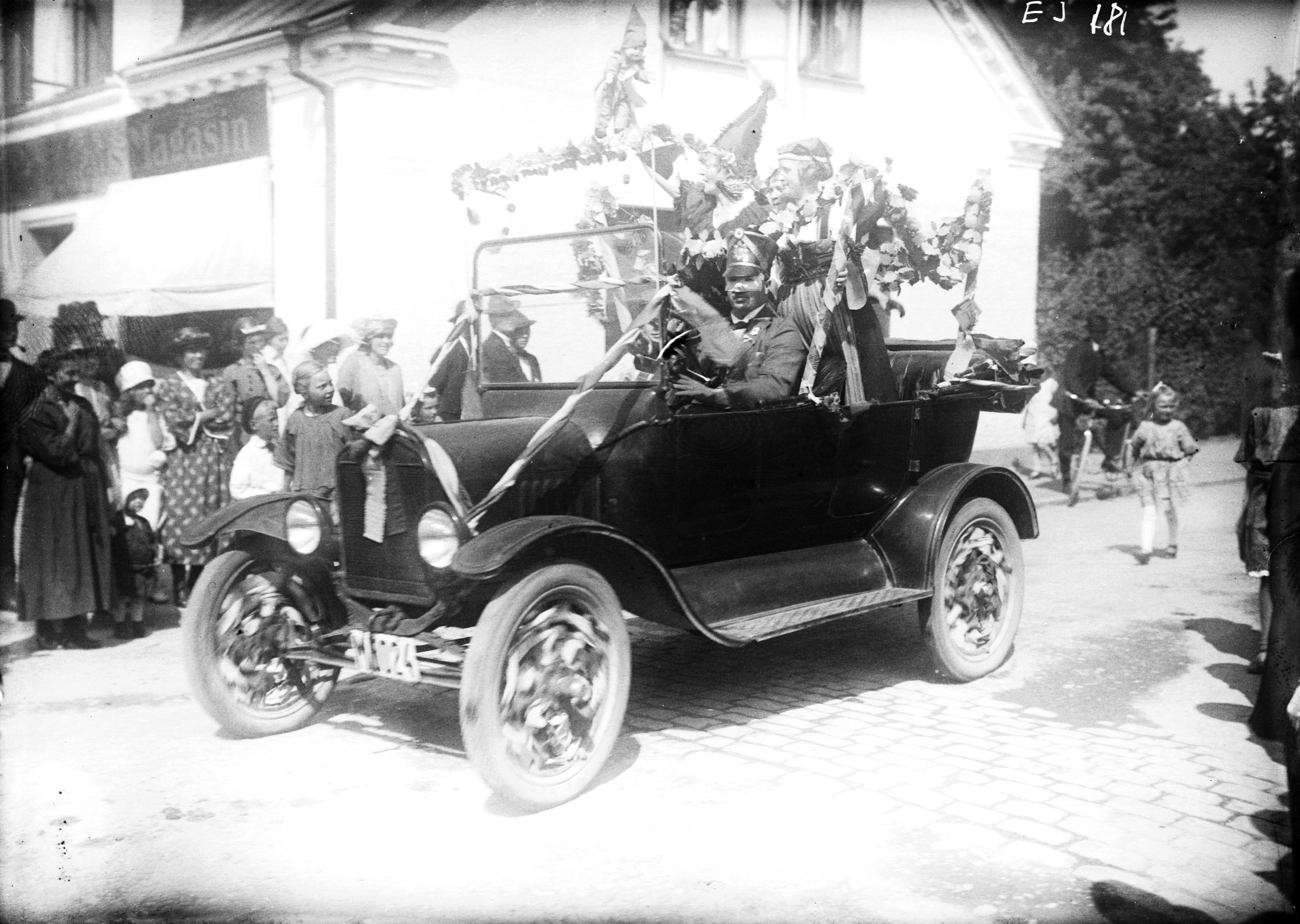 Blomsterprydd öppen bil troligen av märket Ford med nationalklädda damer
