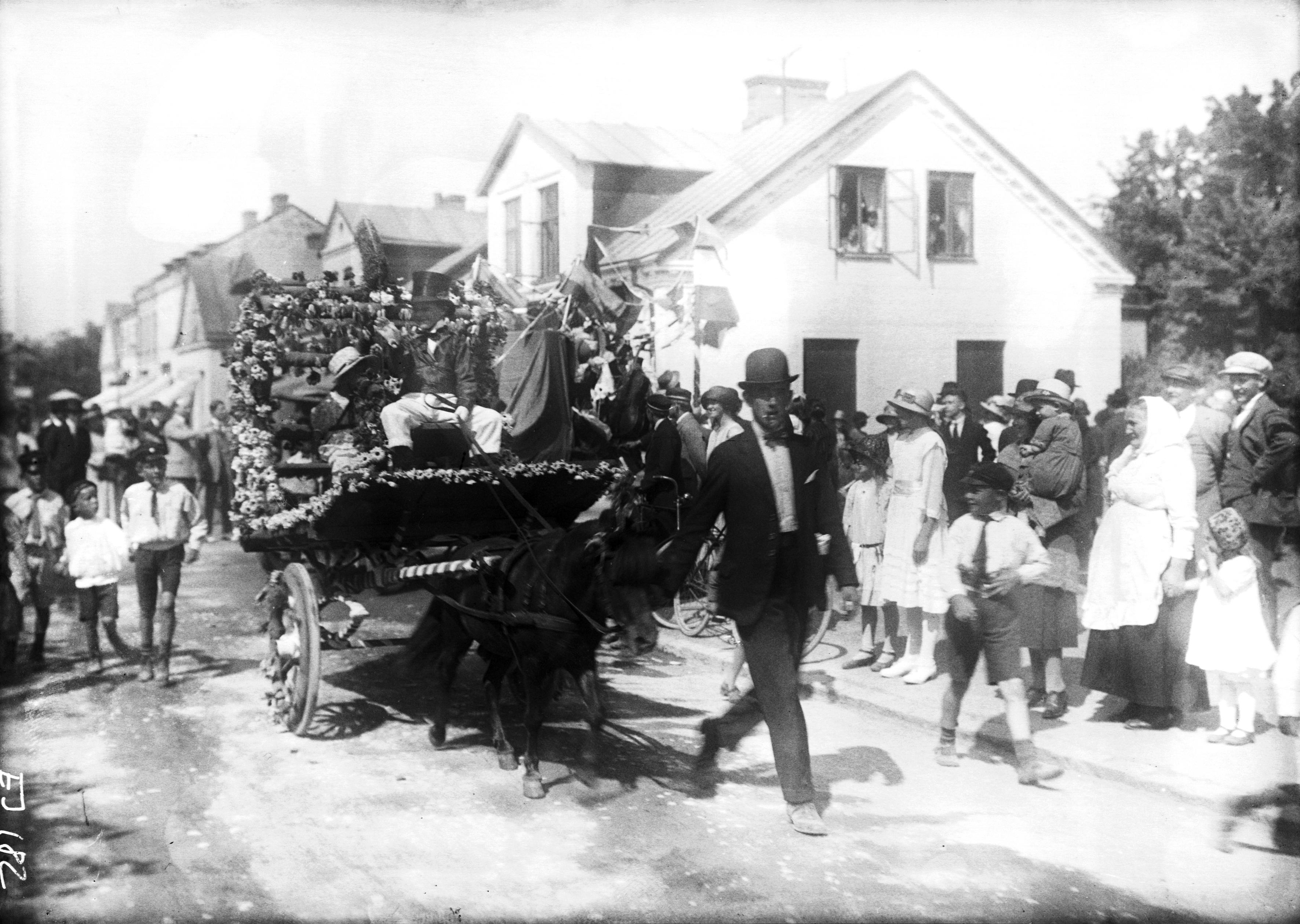 Blomsterprydd vagn, dragen av en ponny. Folk på trottoarerna.