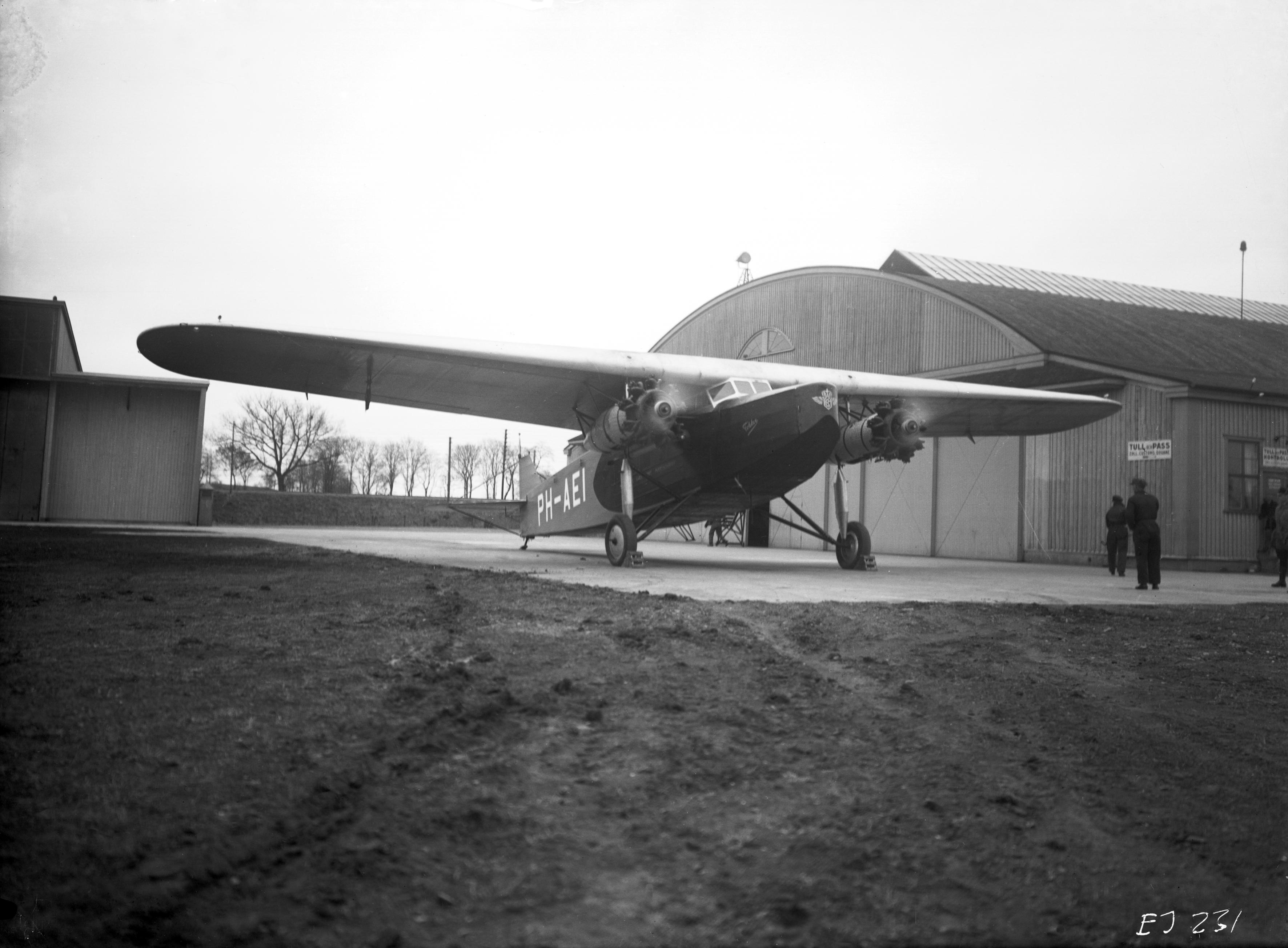 Malmö. Bulltofta på 1930-talet. En Fokker F VIII tillhörig KLM. I bakgrunden Hangar 3 och Hangar 2. Flygplan med registreringen PH-AEI.