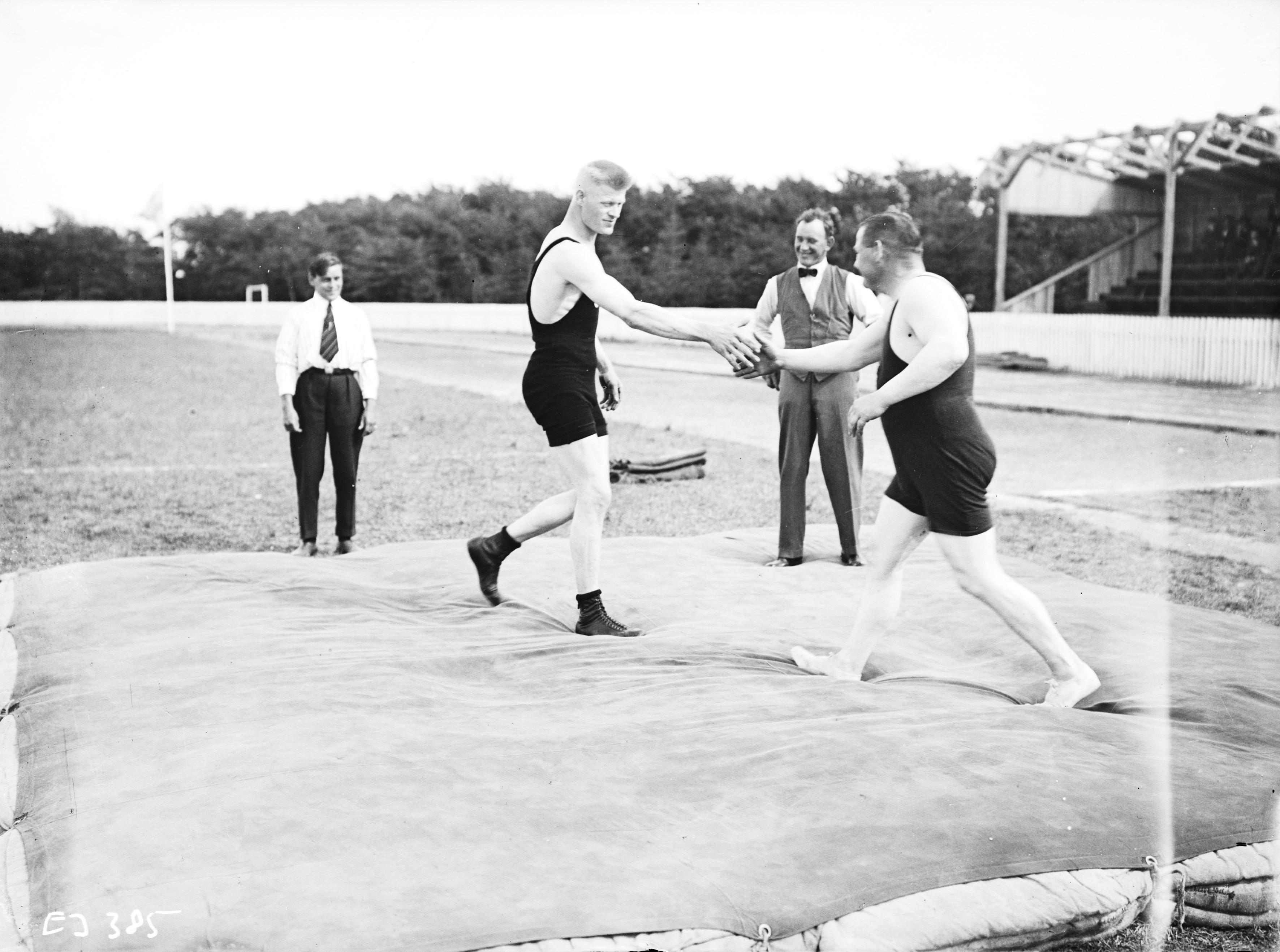 Brottning på idrottsplatsen. Johan Richthoff till vänster.