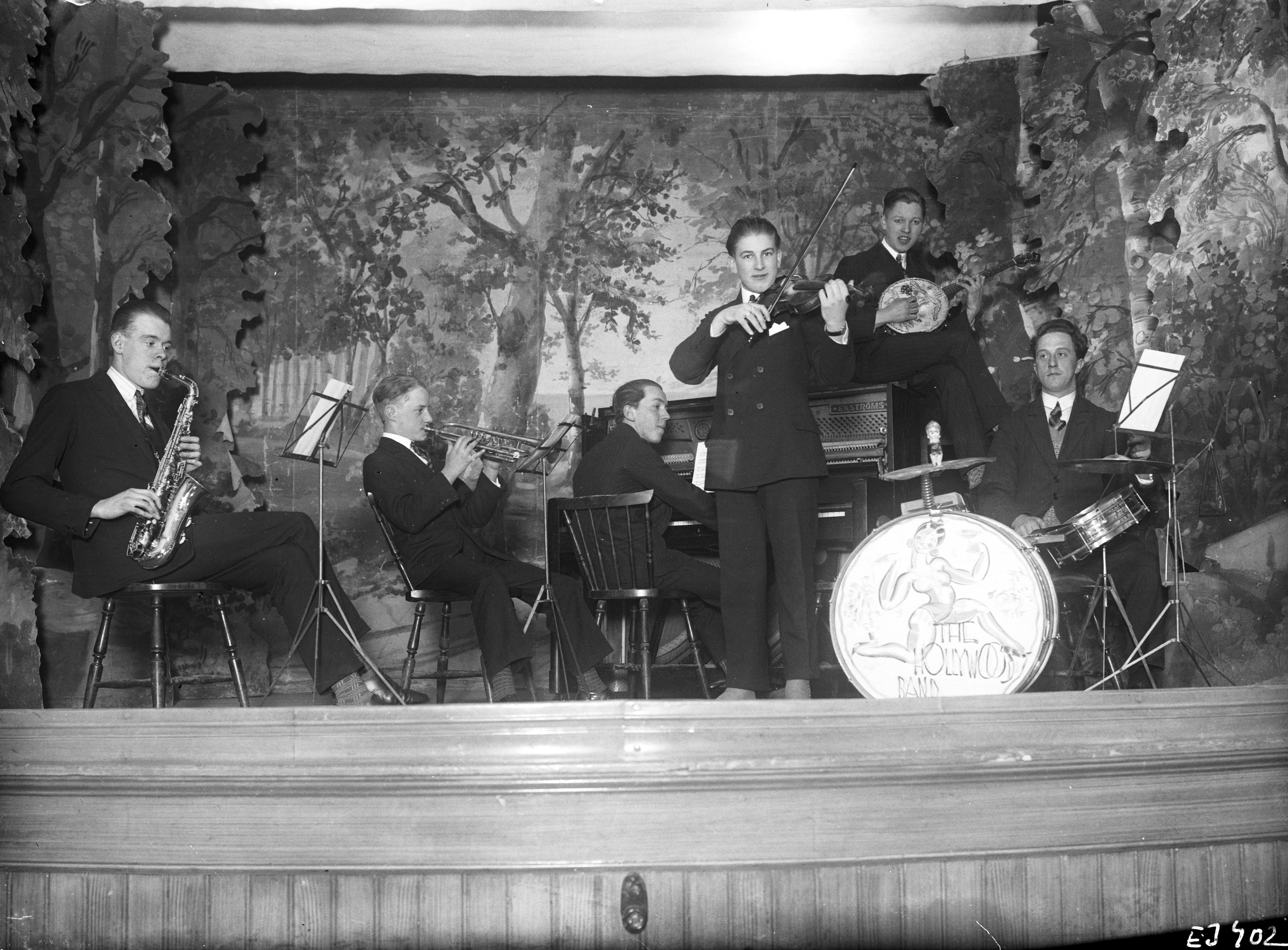 EJ 000402 :: orkester, saxofon, banjo, trumma, piano, trumpet, notställ