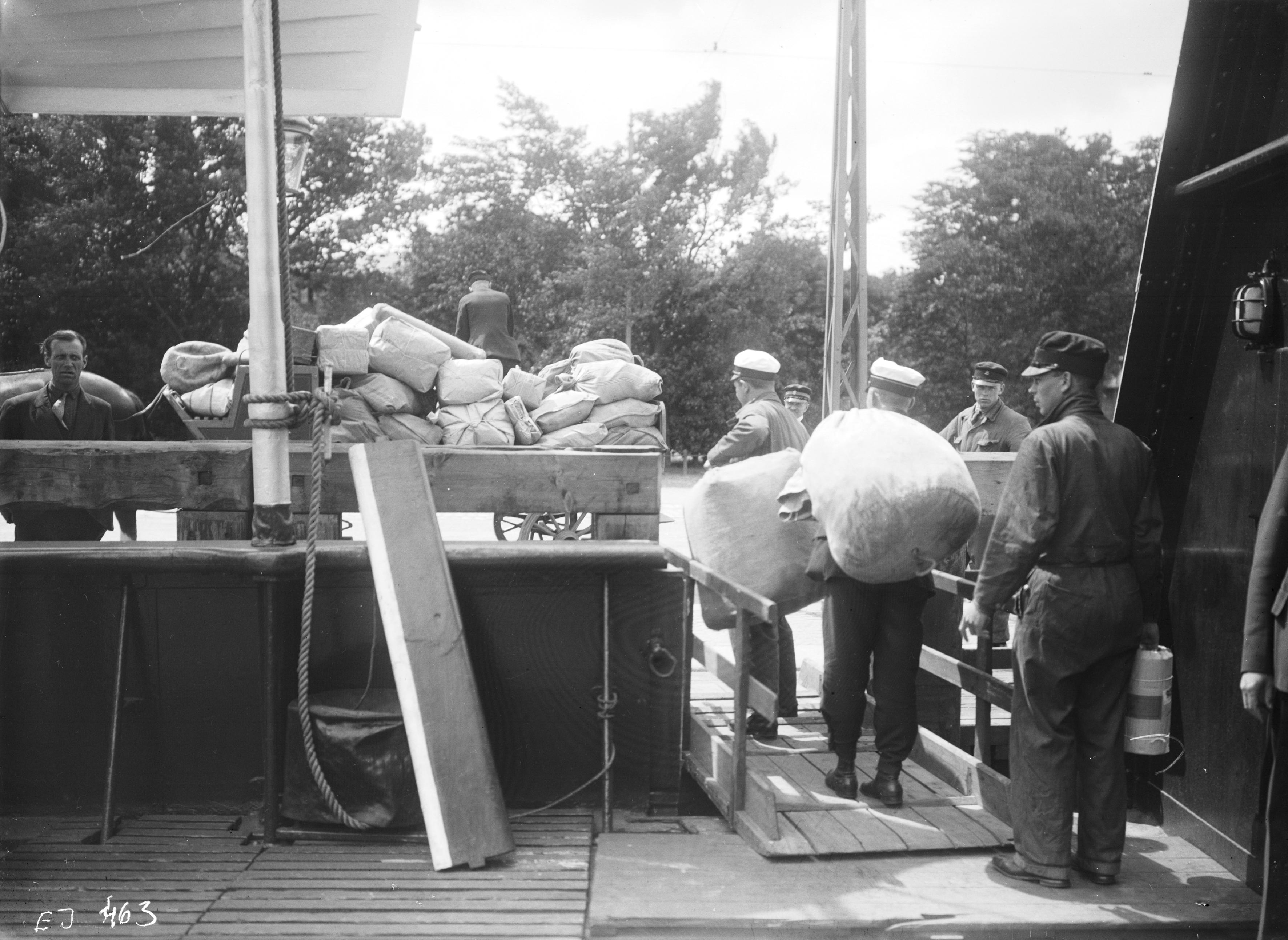 Juni 1931, lossning av postsäckar vid färjan. För Generalpoststyrelsen
