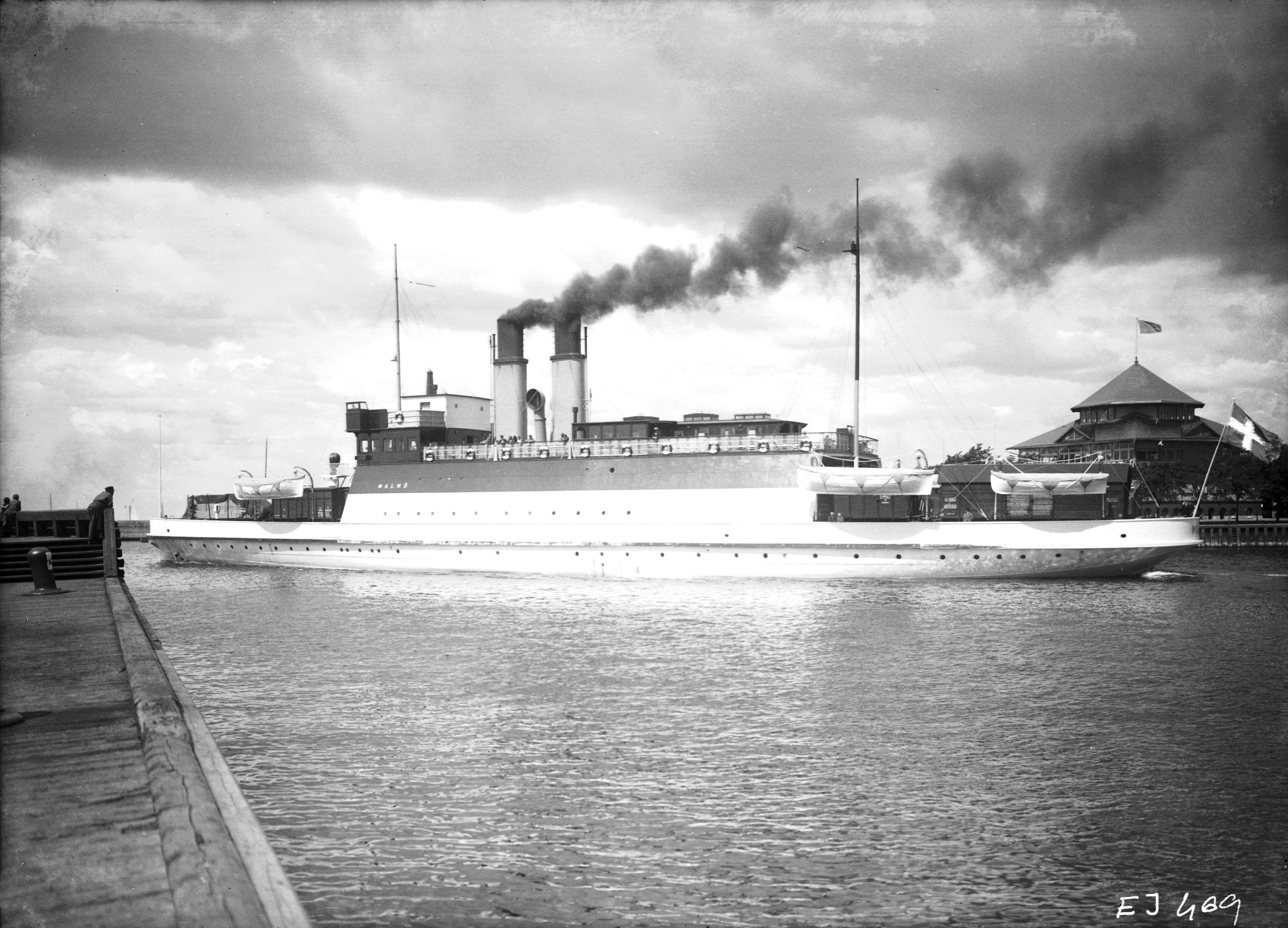 Färjan " Malmö " i hamnbassängen, paviljongen i bakgrunden, juni 1931. För Generalpoststyrelsen