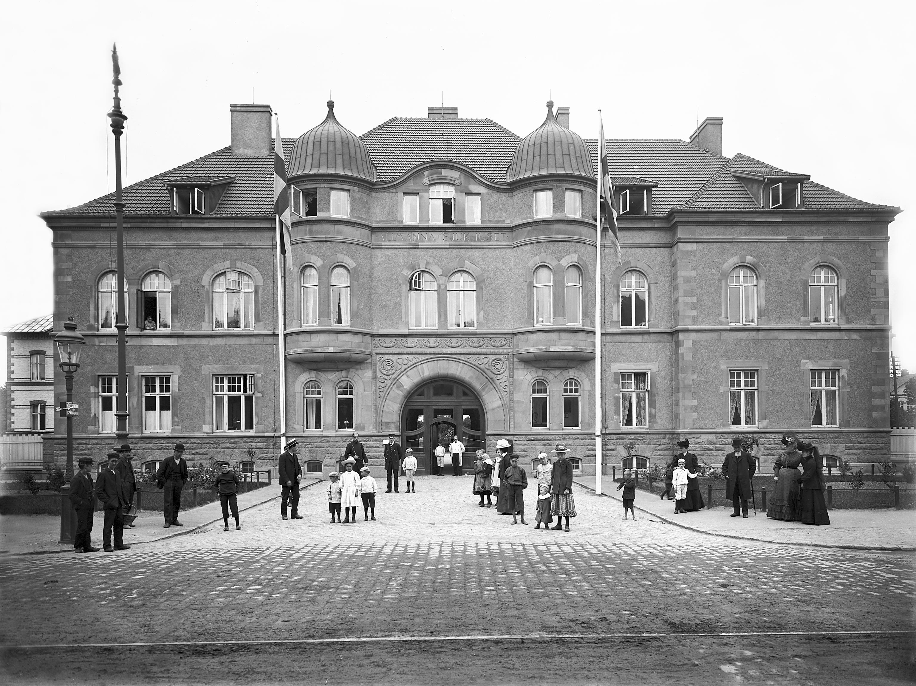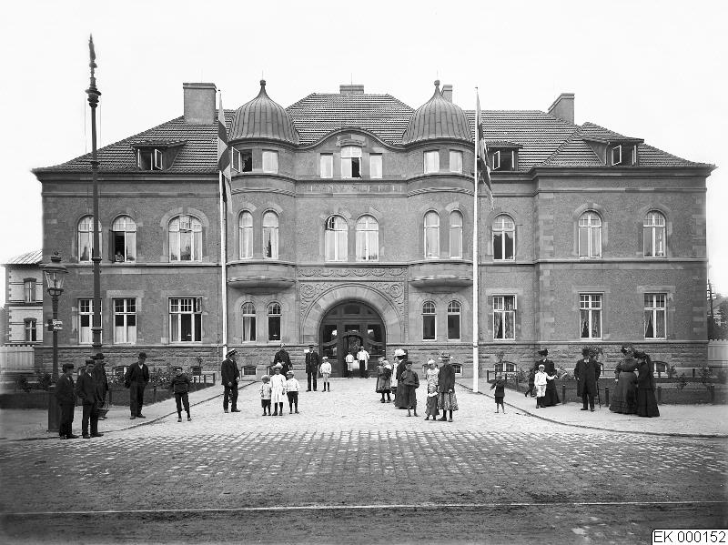 Malmö Allmänna Sjukhus, exteriör, människor i förgrunden