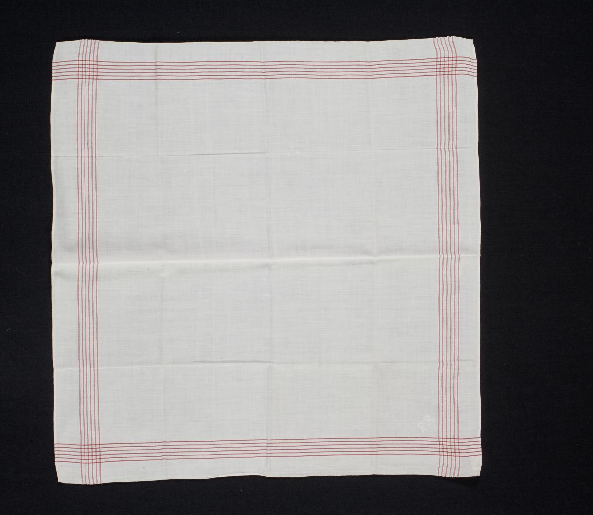 Vitt linne med röda invävda bårder. Monogram i plattsöm: E R.