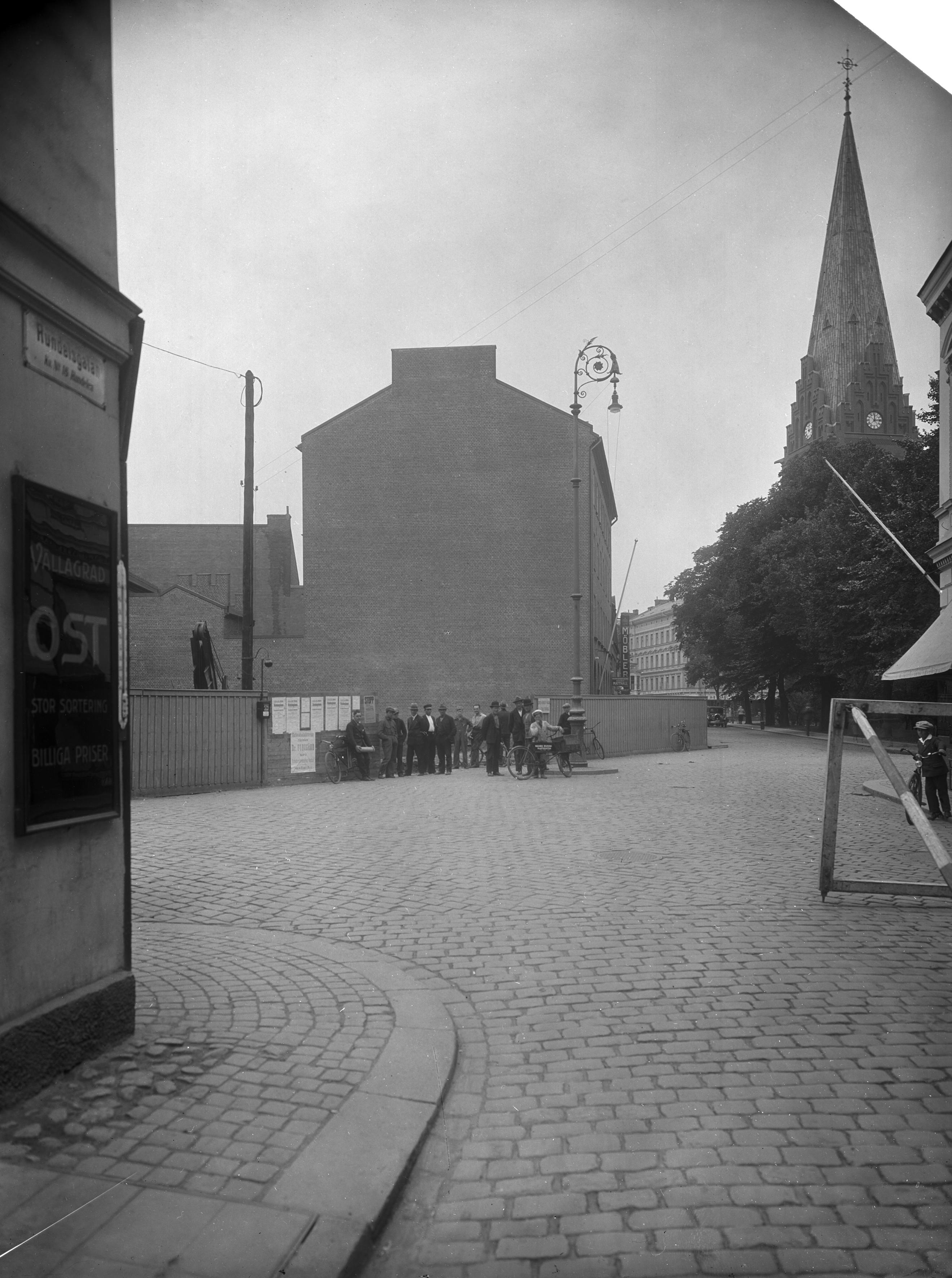 Gatan in vänster är Djäknegatan. På bilden har ett hörn av kvarteret Von Conow rivits. Detta bör då ha varit huset med Conowska Ladugården och Gjertssonska Stiftelsens hus.