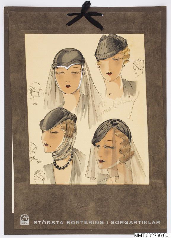 - Modeplansch, litografi tryckt på transparent papper, handkolorerat. Planschen är monterad på bakstycke och passepartout, sorgband knutet i övre mitten. Text på passepartouten: [i blindtryck] Hasselblads / Göteborg. [i silvertryck] Största sortering i sorgartiklar. Text i bilden: Pour le deuil.