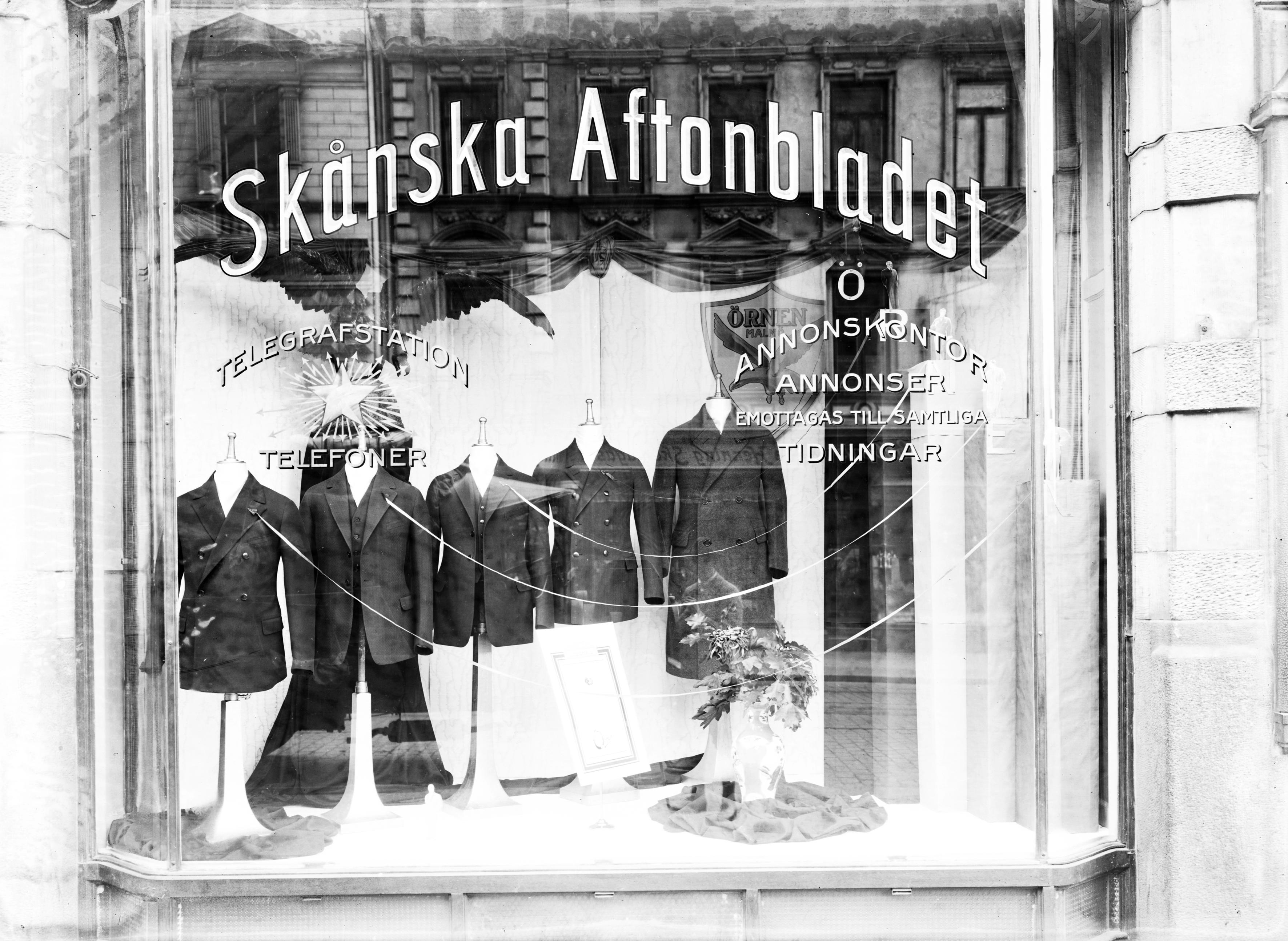 Skyltfönster, Örnens Herrekipering i Skånska Aftonbladets fönster, S. Förstadsgatan 10 (vilket det inte är - Bilden är från Södergatan 32).