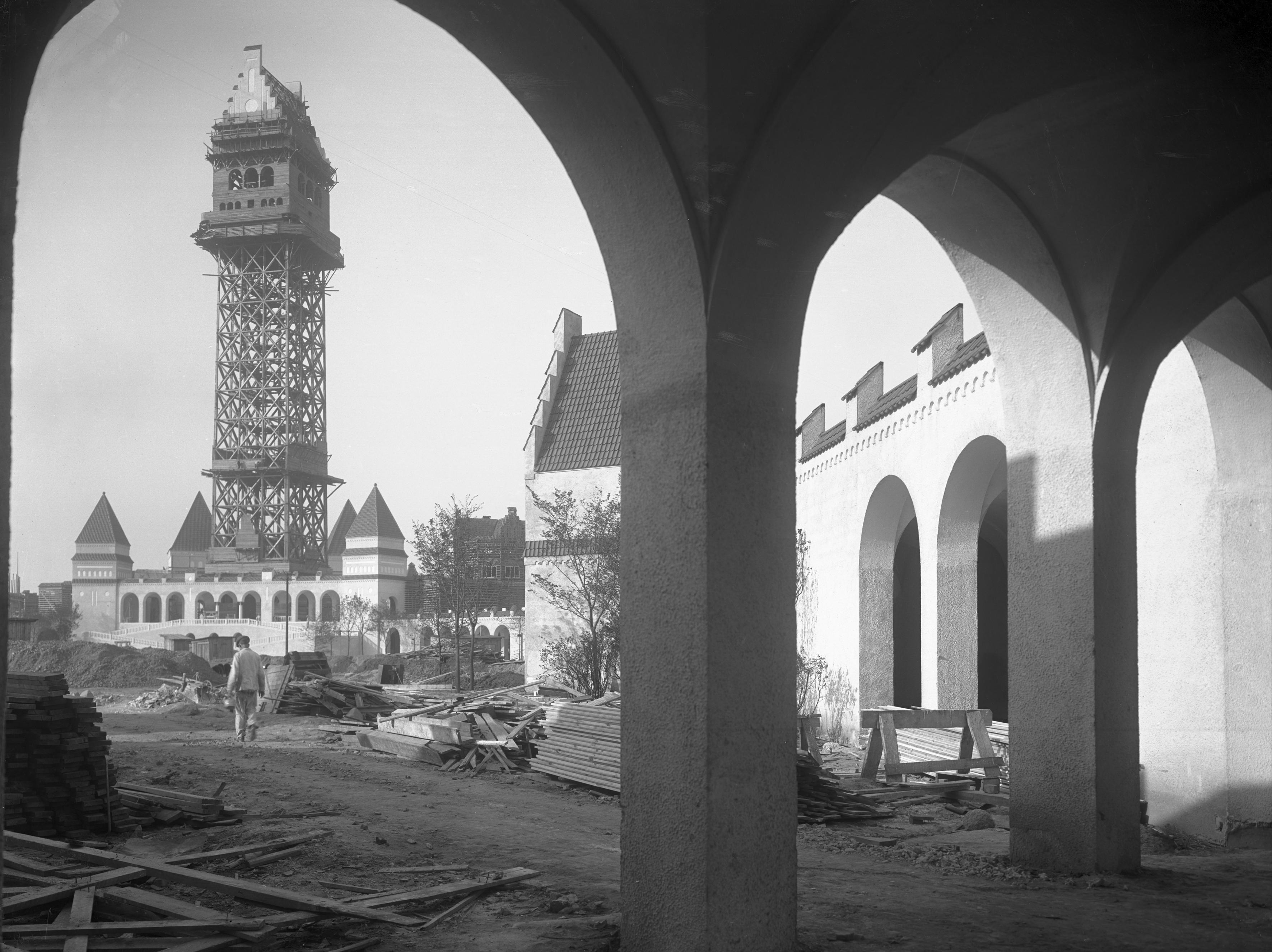 Byggandet av Baltiska utställningen. Centralgården mot Stora Tornet den 17 maj 1913.