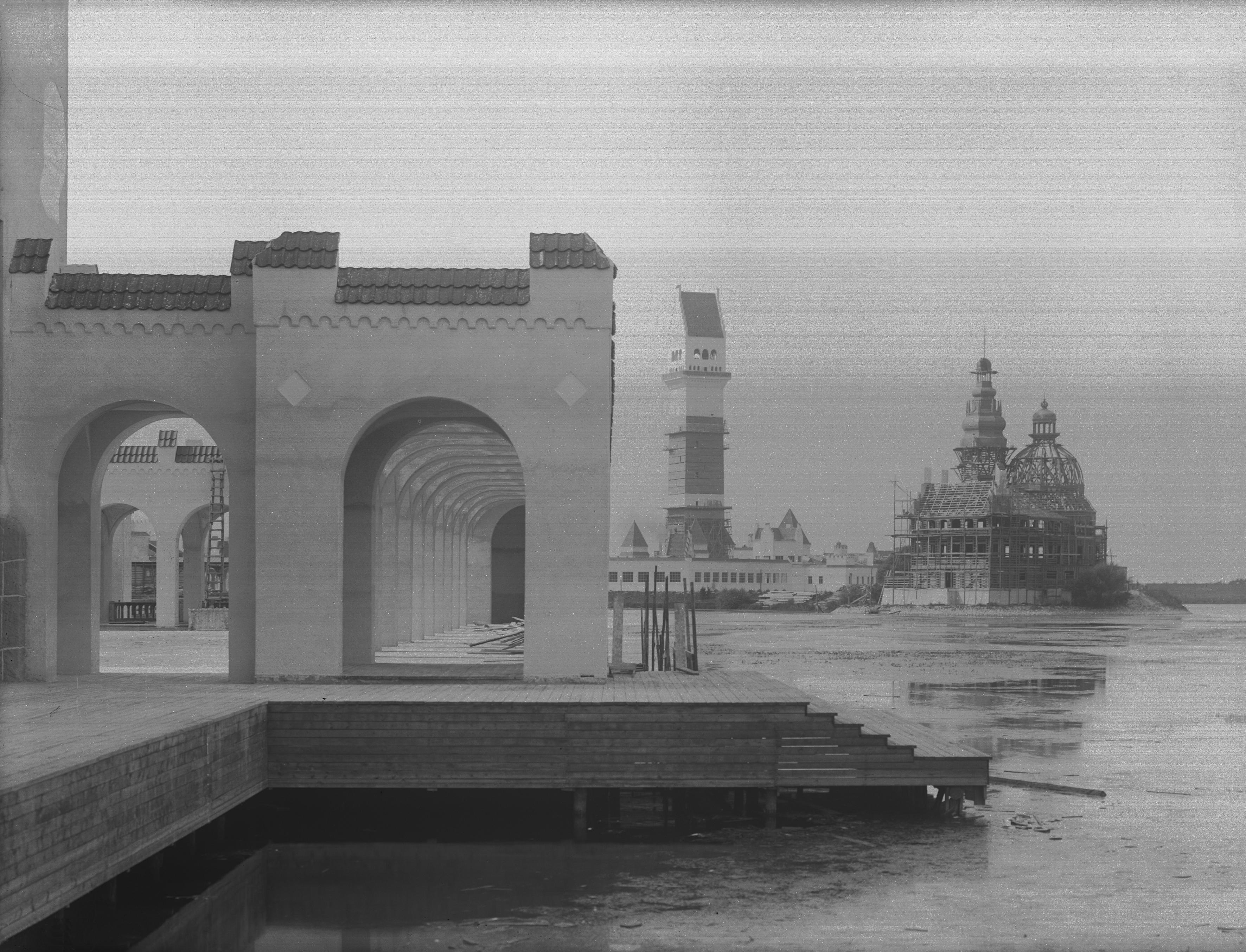Byggandet av Baltiska utställlningen. Konsthallen vid Storsjön den 10 juli 1913. Vy mot Stora Tornet och Restaurang Kastellet.