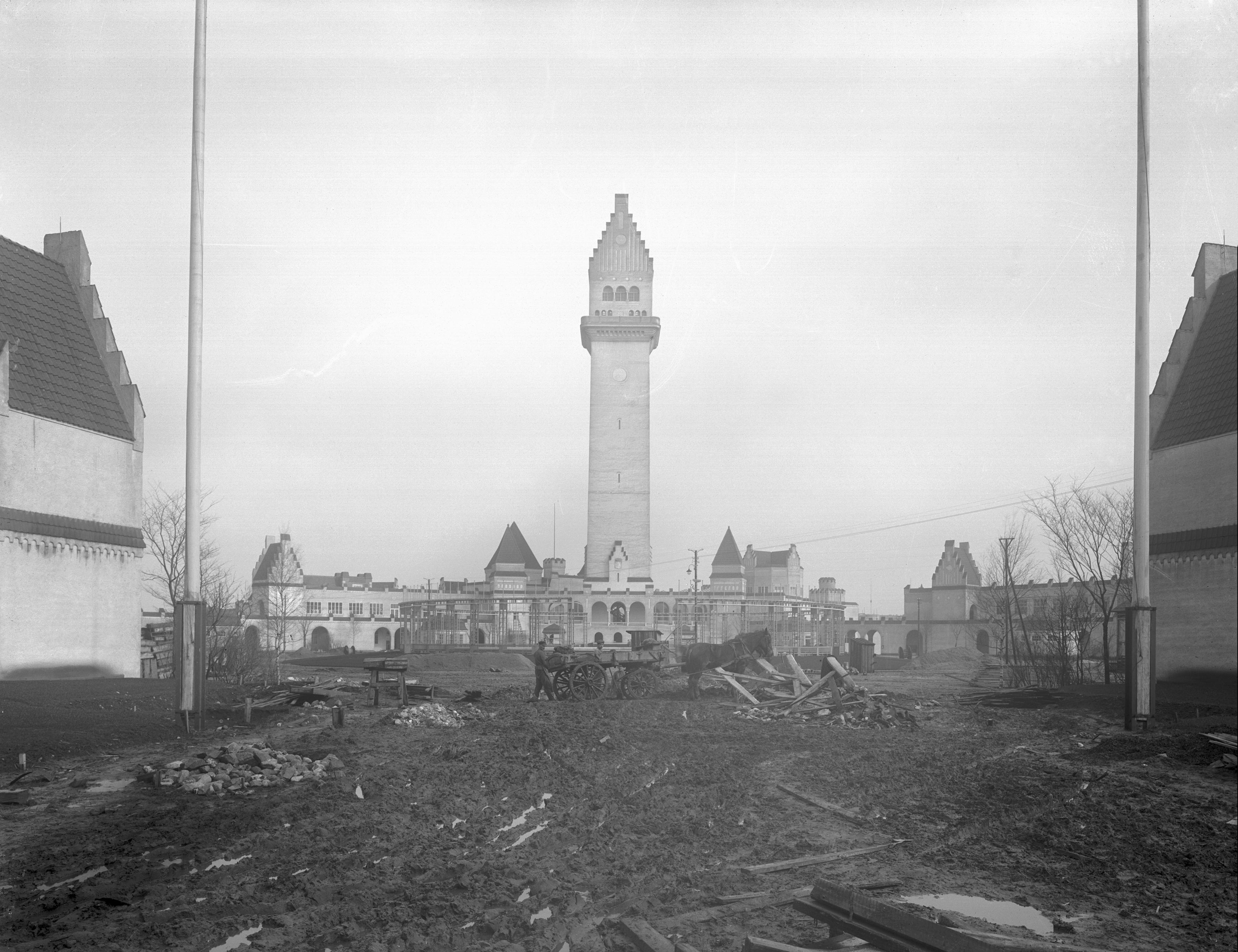 EM 000642 :: utställning, byggnadsarbete, häst, vagn, telefonledning, utomhusbelysning, flaggstång