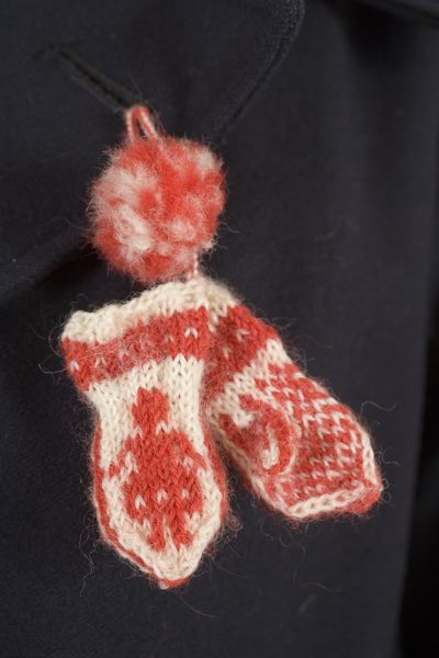 Mönsterstickade tumvantar på vänster slag, rött och vitt ullgarn.