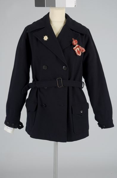 dubbelknäppt med blå knappar, två stycken utanpåfickor, lång ärm,
