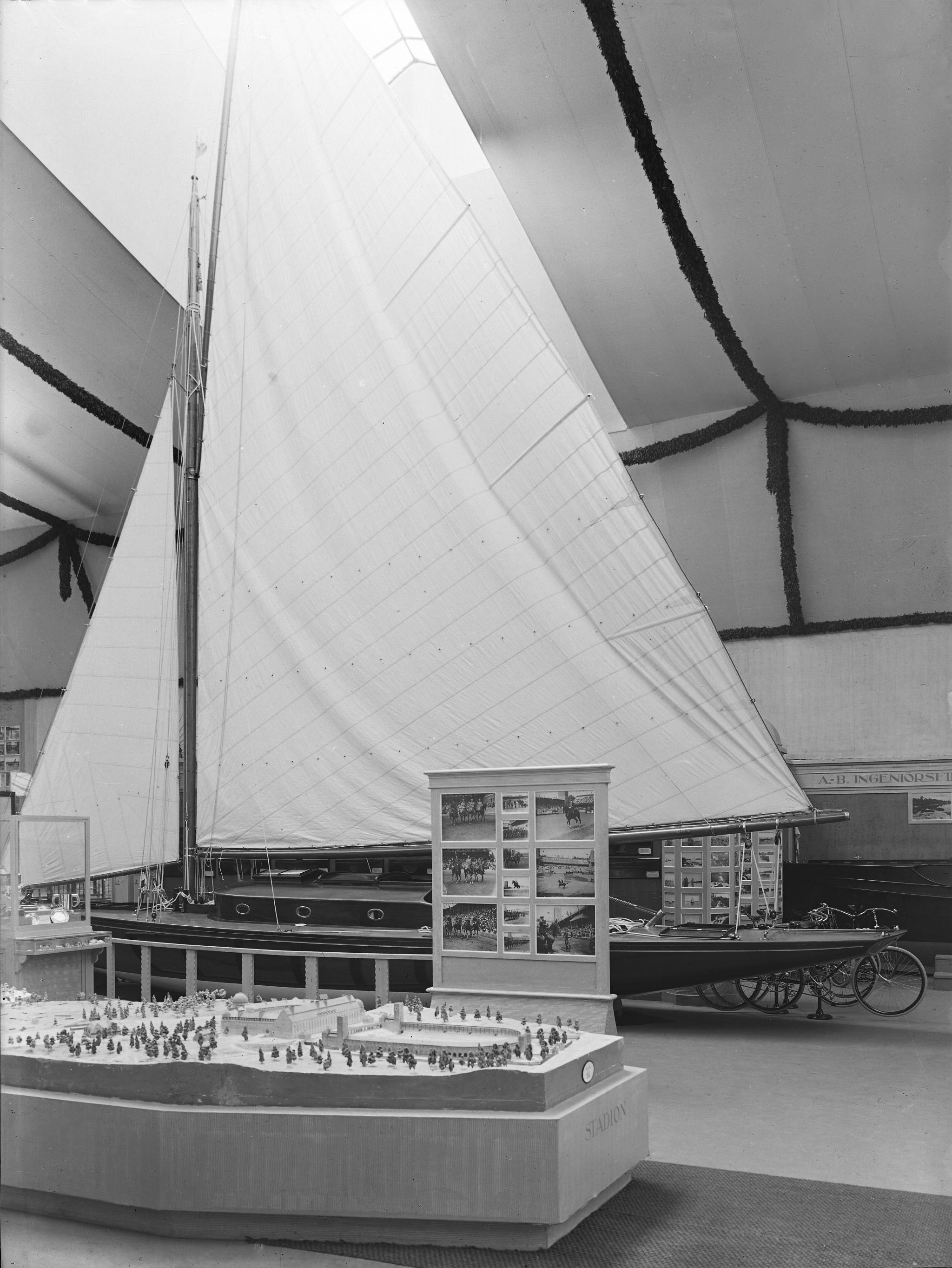 Idrottsutställn. Interiör med segelbåt (modellbygge av Råsunda Stadion, Stockholm)