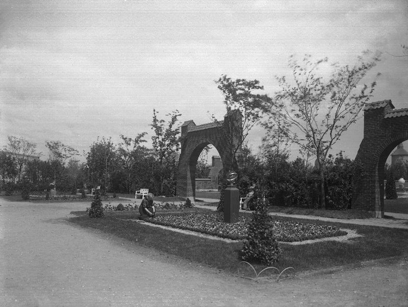 utställning; blomrabatt; solur; bänk; vattentorn