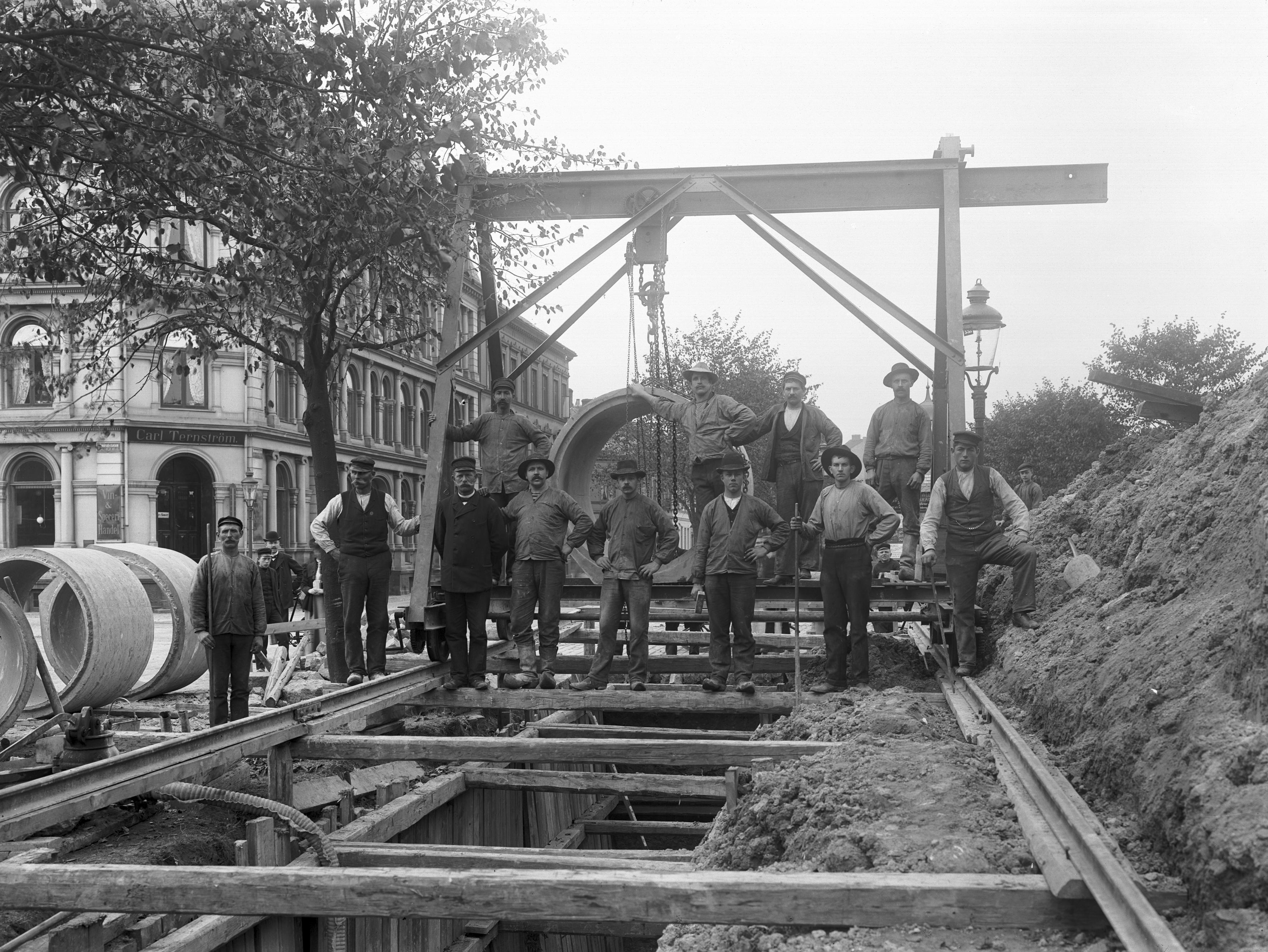 - Gatuarbete på Drottninggatan just före Amiralsgatan, vars hörnhus i kvarteret Brita som kan ses till vänster.