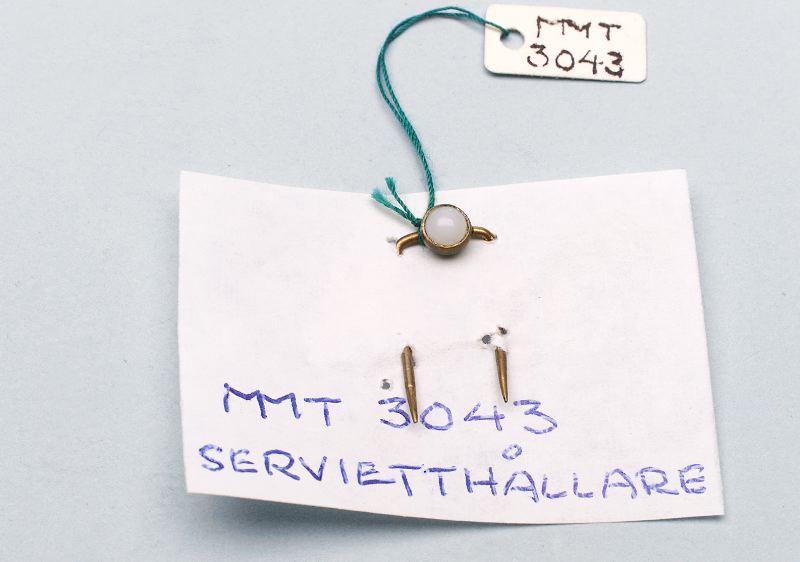 Nål av gulmetall med vit glasflusspärla använd som servietthållare.
