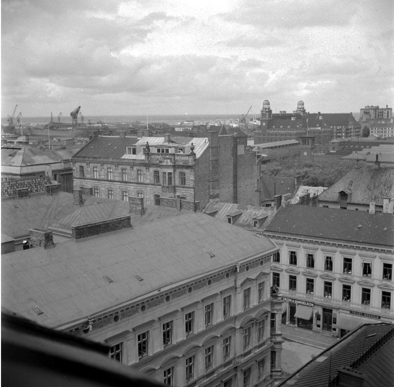 Utsikt från S:t Petri kyrka mot norr, kv. Michelsen t. h. I bakgrunden Posthuset