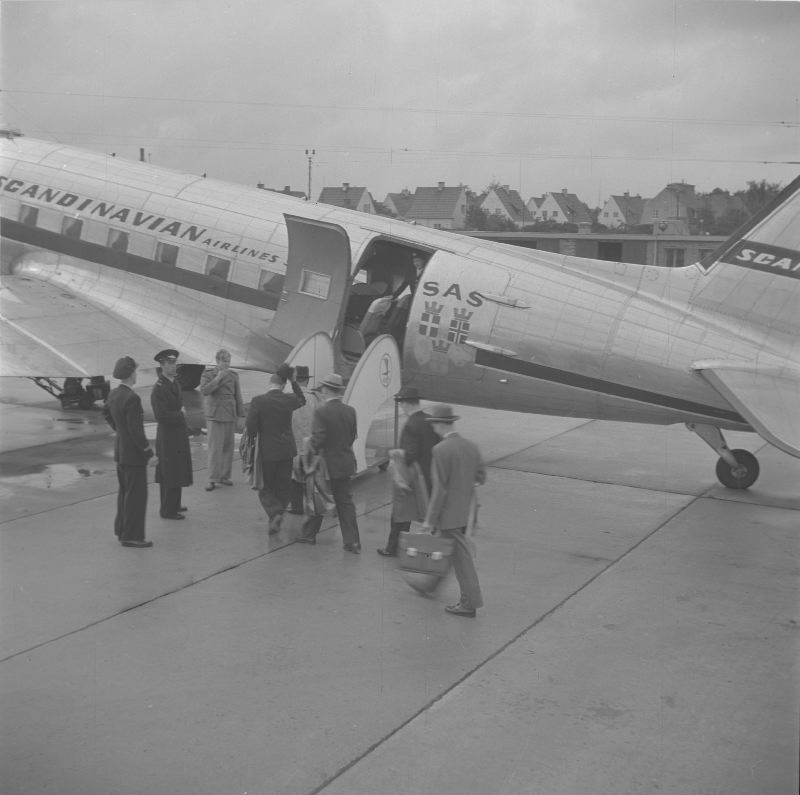 DC-3 "Sven Viking" på Bulltofta. Passagerare stiger ombord flygplanet.