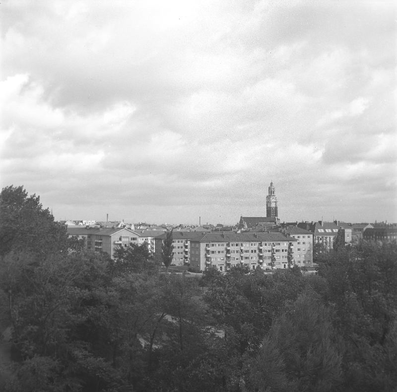 Utsikt över södra stadsdelen av Malmö, S:t Johannes kyrktornet i bakgrunden