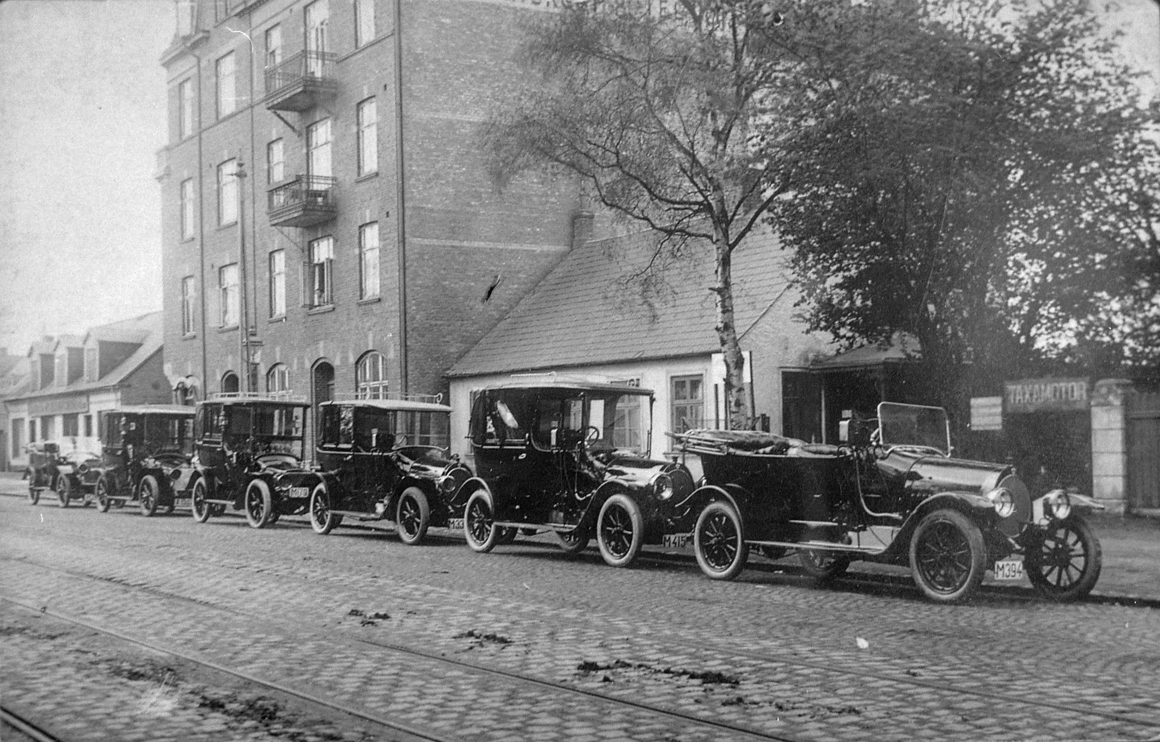 Taxibilar vid Taxamotor på Södra Förstadsgatan. Ägaren till firman hette Johan Malmqvist.