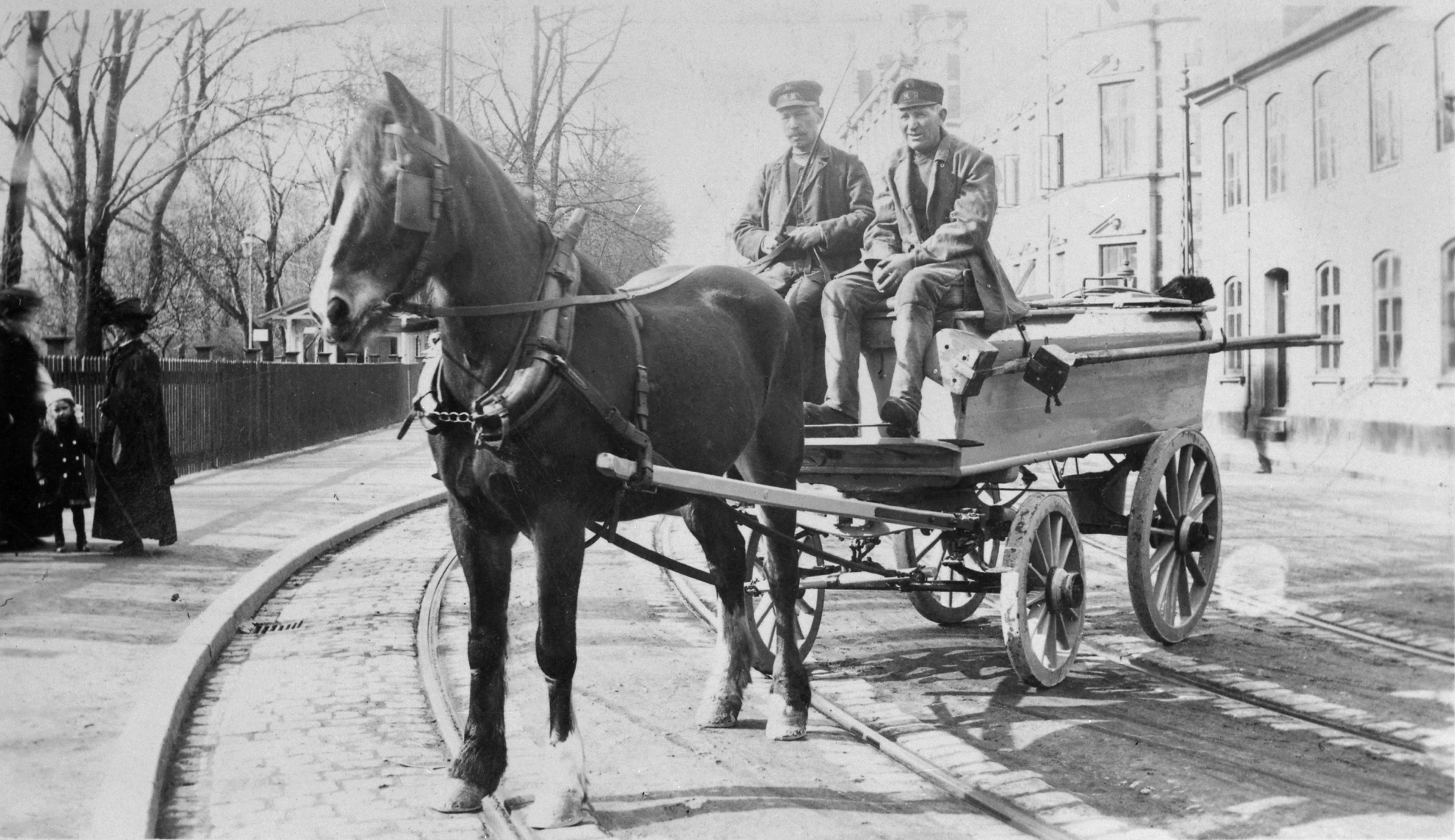 Häst och vagn, renhållningsverkets dagliga rensningar av avloppssystemet. Kusken Arild Jönsson.