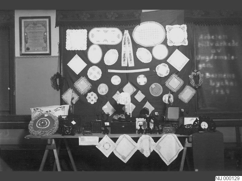 Utställda föremål, spetsar, dukar m.m. tillverkade av ungdomslagen Barnens Lycka 1924