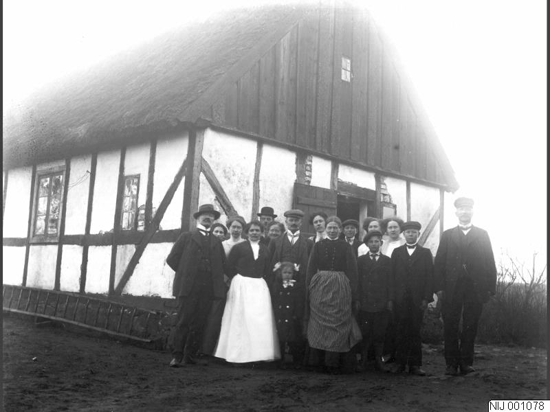 NIJ 001078 :: korsvirkeshus, halmtak, stege, grupporträtt