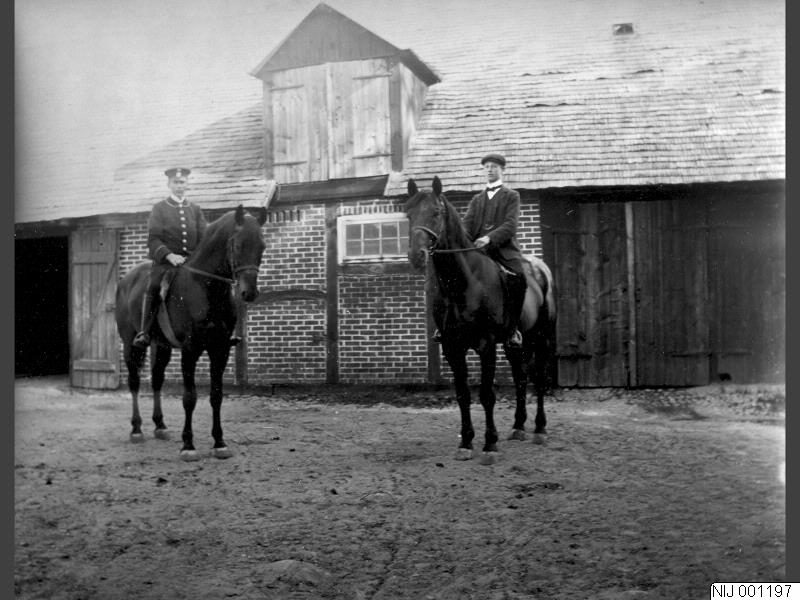 Två män till häst framför ett stall